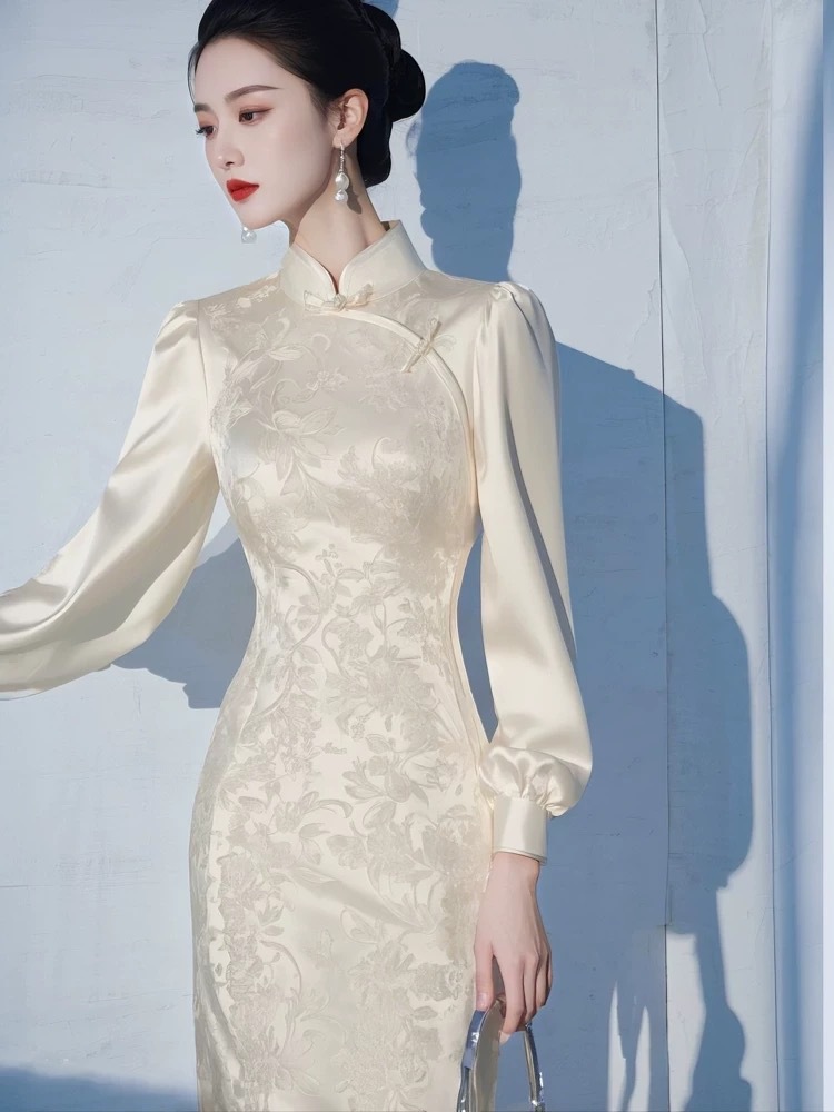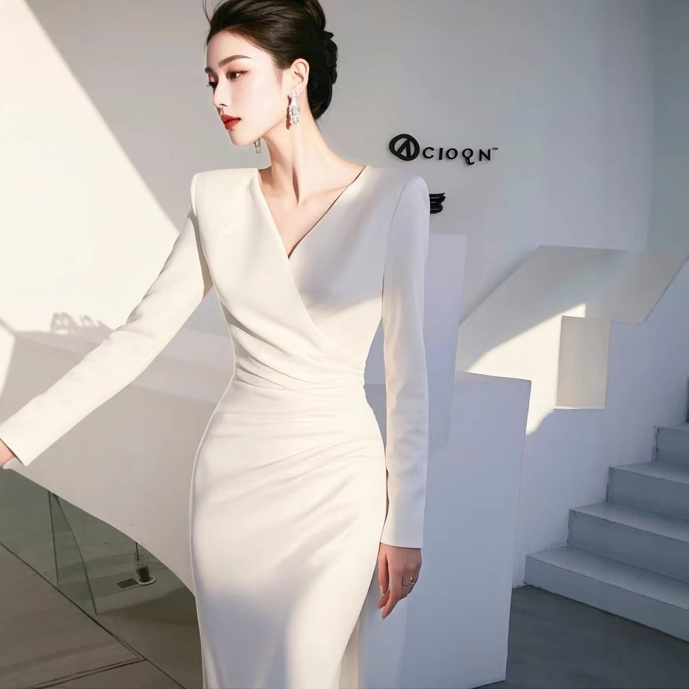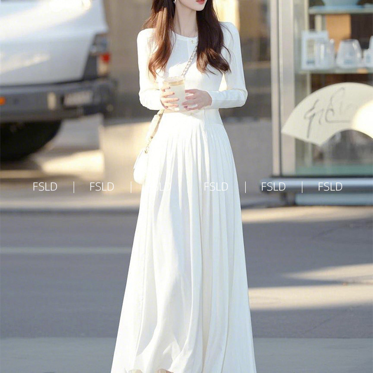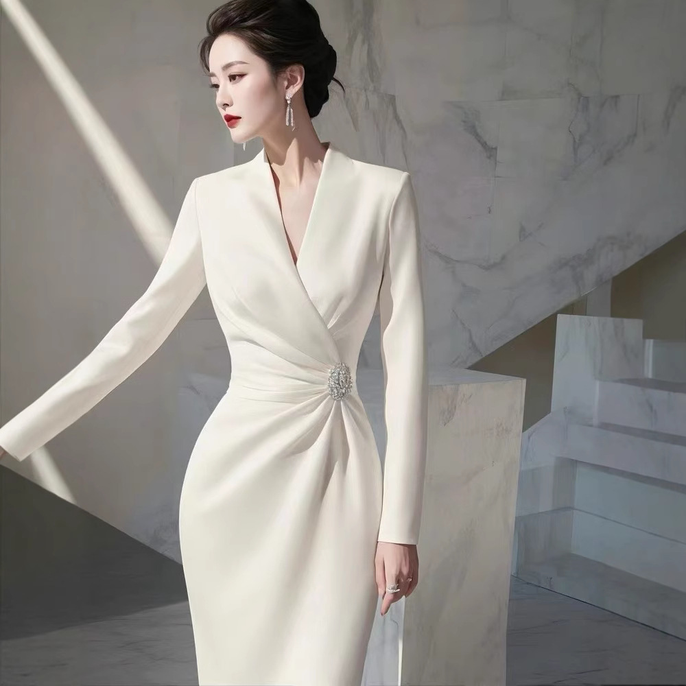 4095 重要な行事に出席するためのコートの着こなし、白い長袖ワンピース、春の新作、軽やかな高級感