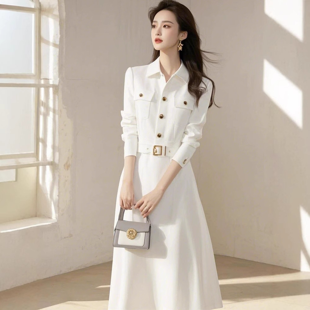 重要な行事に出席する際の上品な気質、高級感のある白いシャツワンピース、春の通勤スタイル