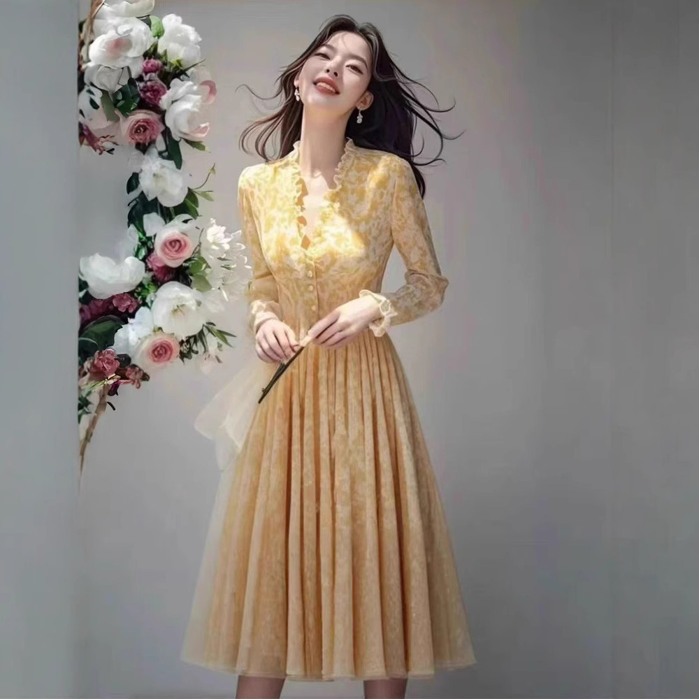 黄色の花柄長袖ワンピース2025 フレンチスタイル 見た目が良い ユニークで美しいスカート 春 ハイウエスト 細見え