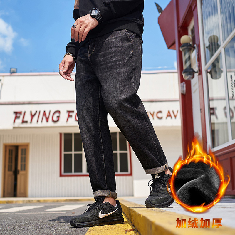 美式复古冬季牛仔裤男大码宽松直筒2025新款保暖抗寒加厚加绒裤子