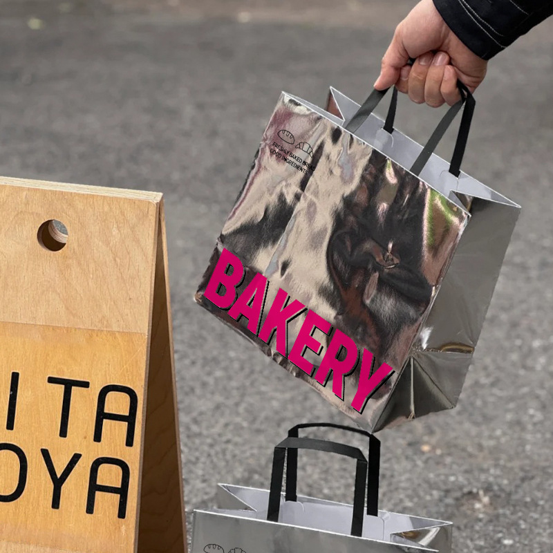 ピンクの鏡面の明るい銀カードの手提げ袋は甘いものを焼きます。