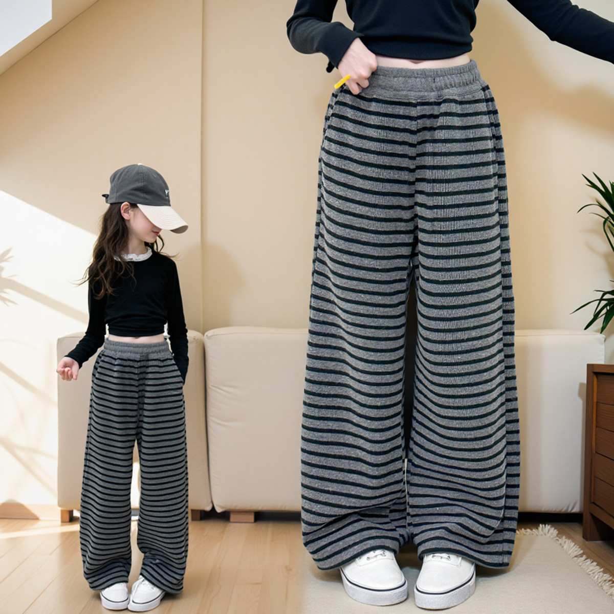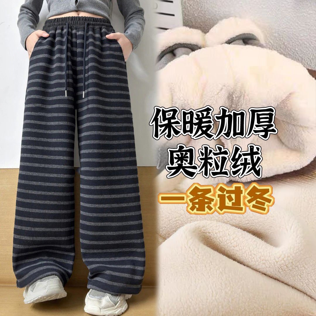 女童加绒阔腿裤冬装2025新款洋气条纹女大童直筒裤加厚保暖长裤潮