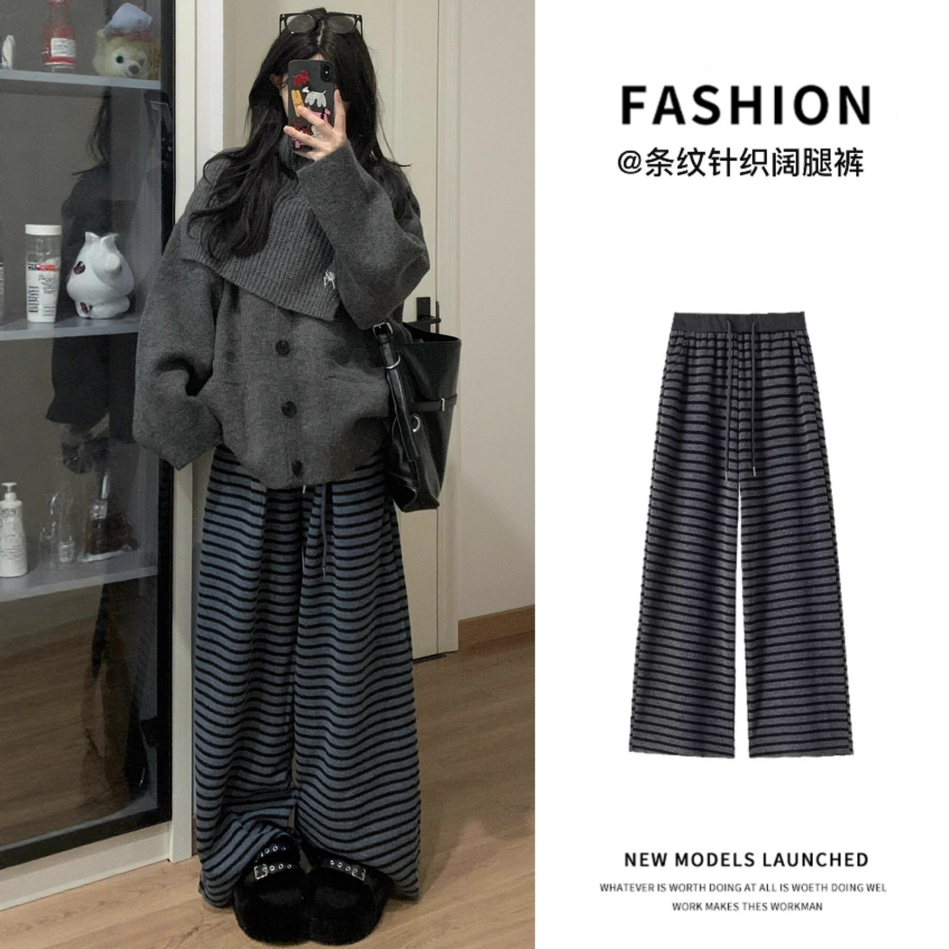 2025秋冬新款宽松慵懒感高腰垂感显瘦拖地长裤舒适撞色条纹阔腿女