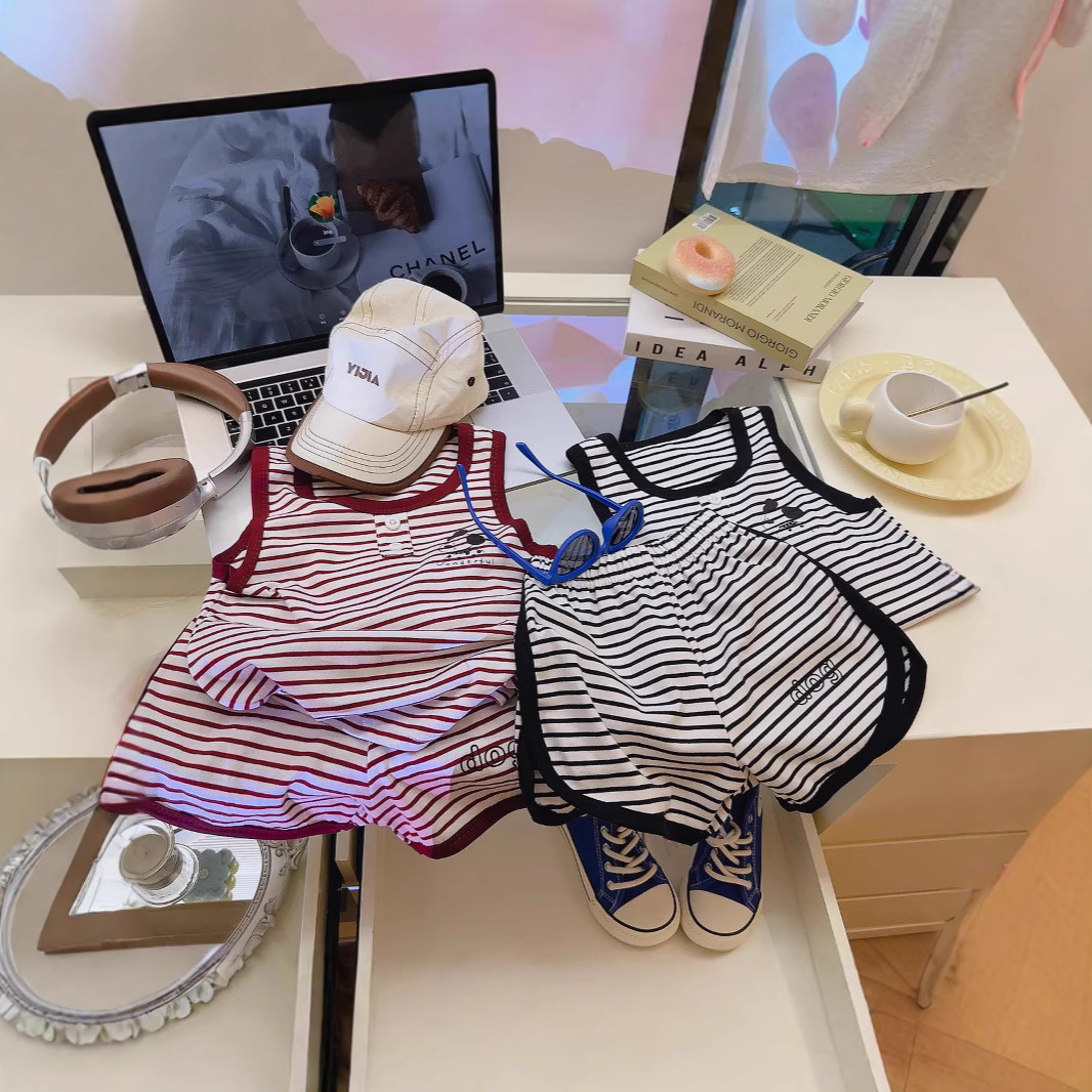 韓国風の新作、配色ストライプ柄の子供用サマーカジュアルスポーツ万能ベスト2点セット(幼児・小学生向け)
