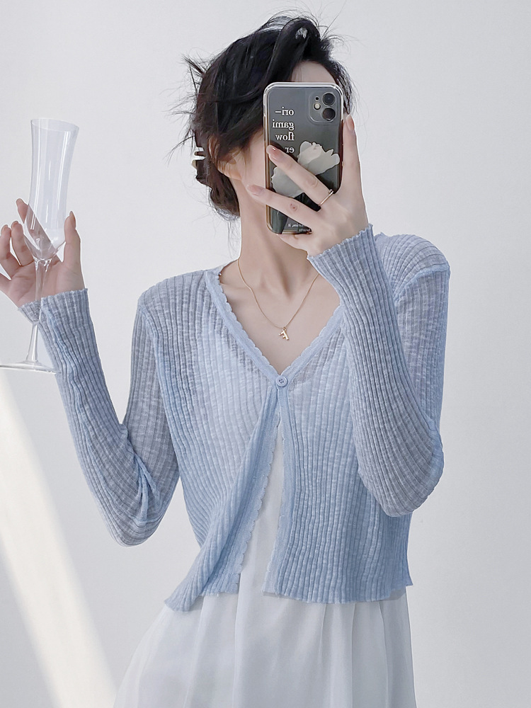 女性用ブラウス、薄手ニットアイスシルクカーディガン、長袖夏黒アウターショートエアコンシャツ、日焼け止めショールトップ