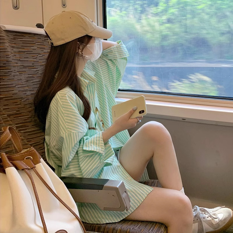 韓国スタイルのハイエンドグリーンストライプシャツ女性のための 2025 夏の新しいルーズ薄いアウターカーディガン日焼け止めトップ