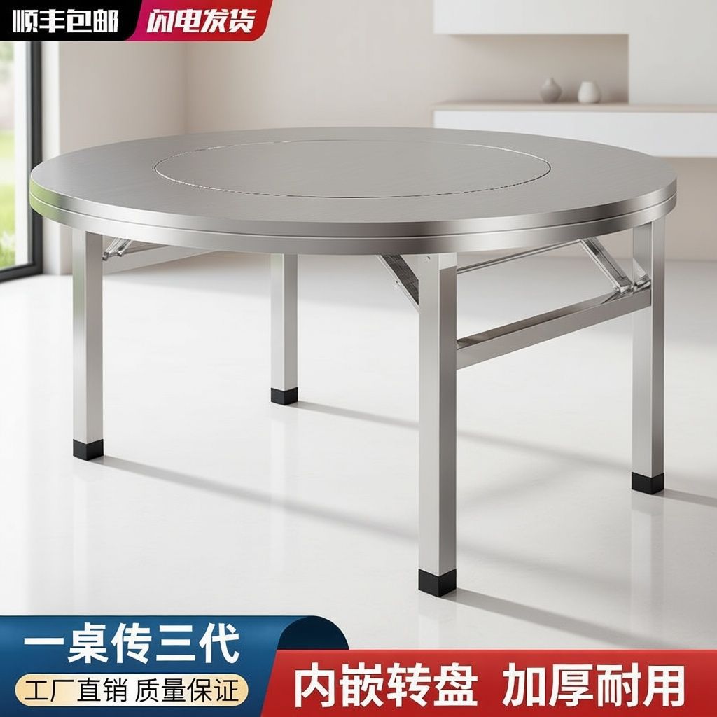 特厚不锈钢圆桌内置转盘折叠桌圆桌带转盘酒店流动酒席不锈钢圆桌