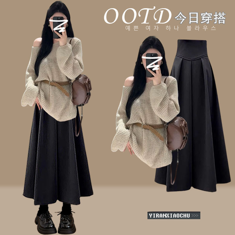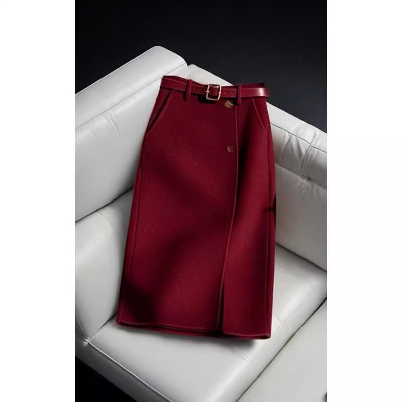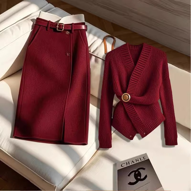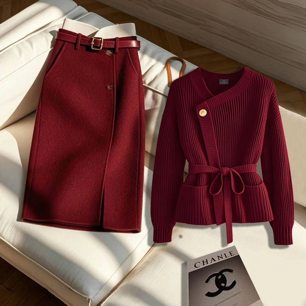 秋冬ファッションセット高級感軽贅沢アンコラ赤ニットファッション赤半身スカート2点セット女性