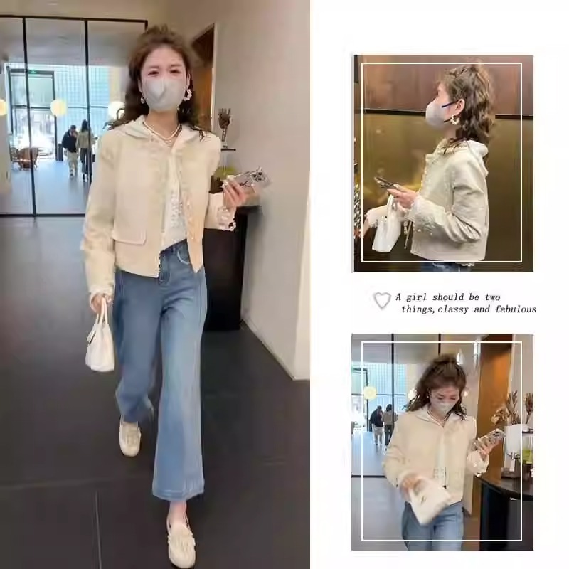 お姉さんの軽熟風は女性の新型の高級なデザイン感を着て帽子の底のシャツのジーパンの3つのセットの服装の湿っています。