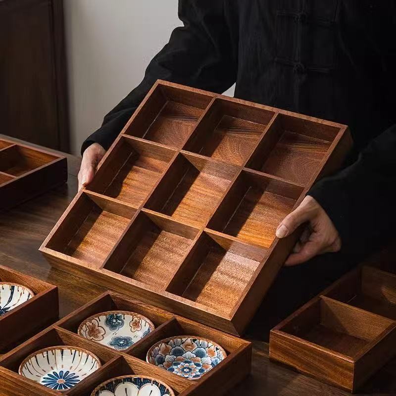 复古色九宫格拼盘家用木质托盘四宫格零食干果盘茶室会所点心拼盘