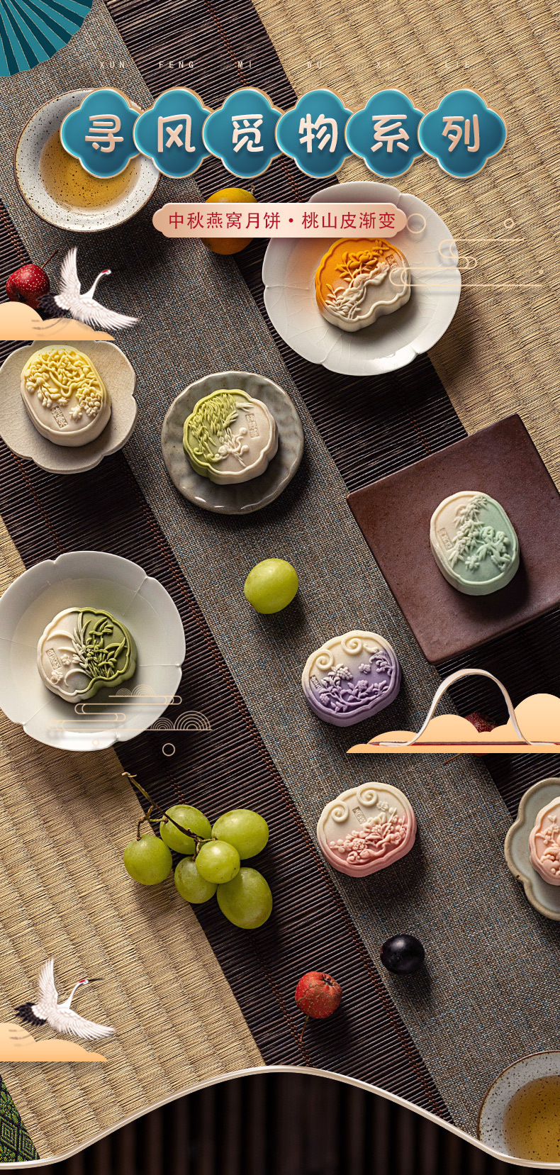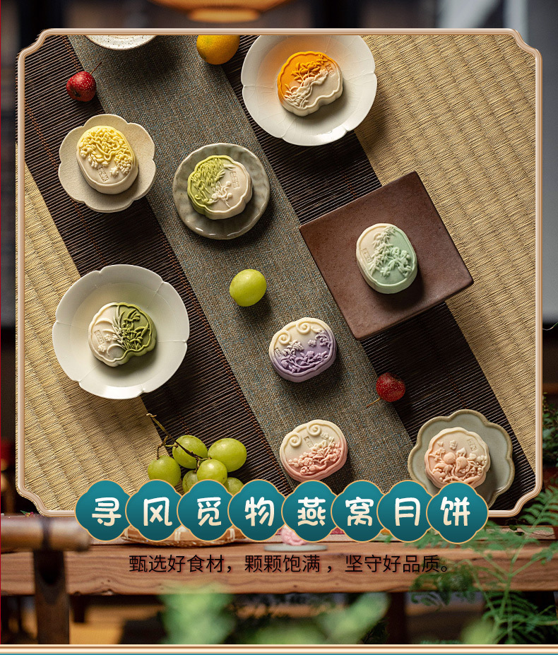 風を探して物のグラデーションの柔らかい心の月餅の国潮の中国式の伝統の菓子の中秋の月餅の卓上の桃山の皮の月餅を探します。