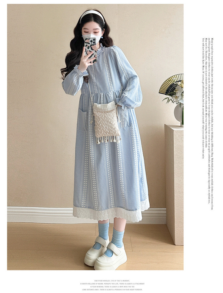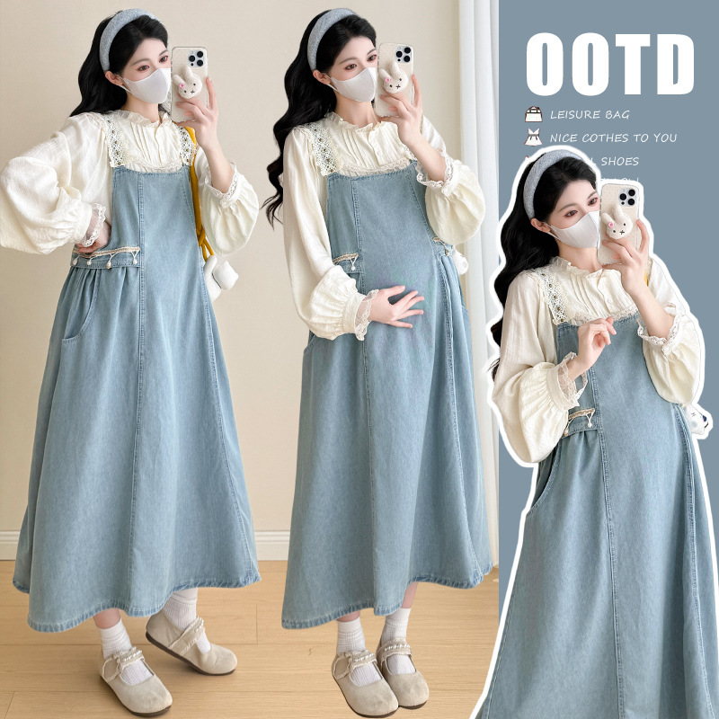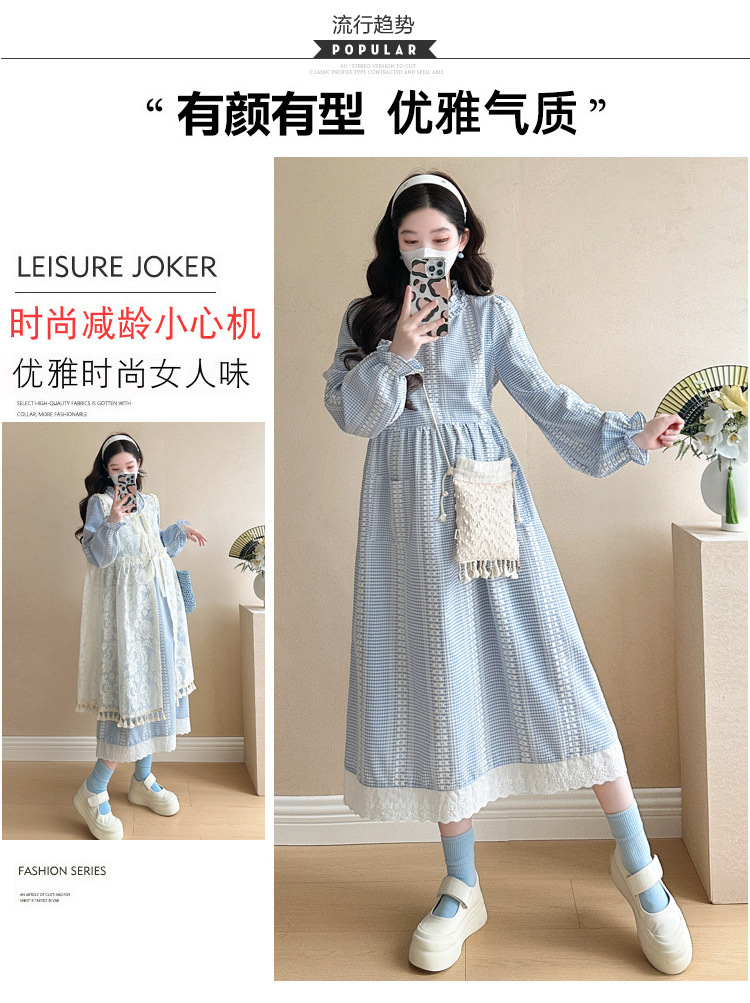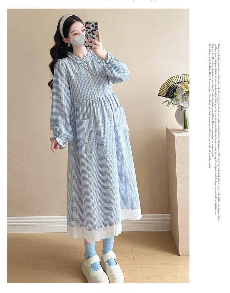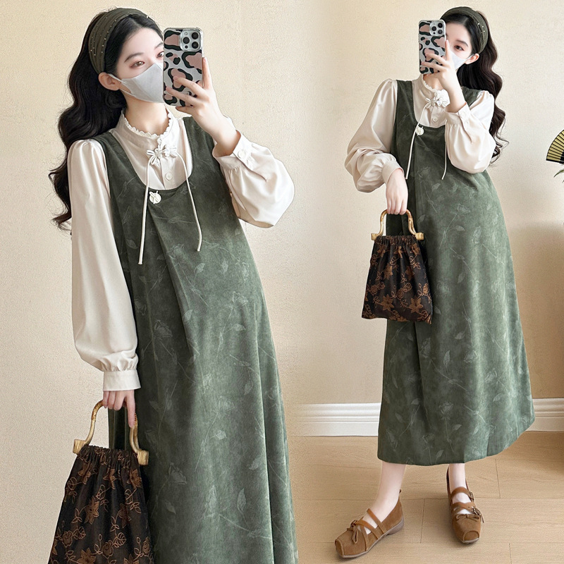 現物妊婦服丸襟長袖シャツワンピース女性2024初秋痩せa字気質長スカート