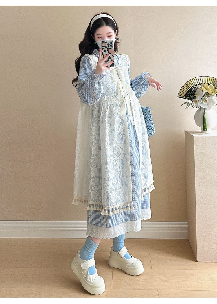 孕妇装2026春季重工提花压褶连衣裙女秋冬长袖孕妇蕾丝长裙内搭