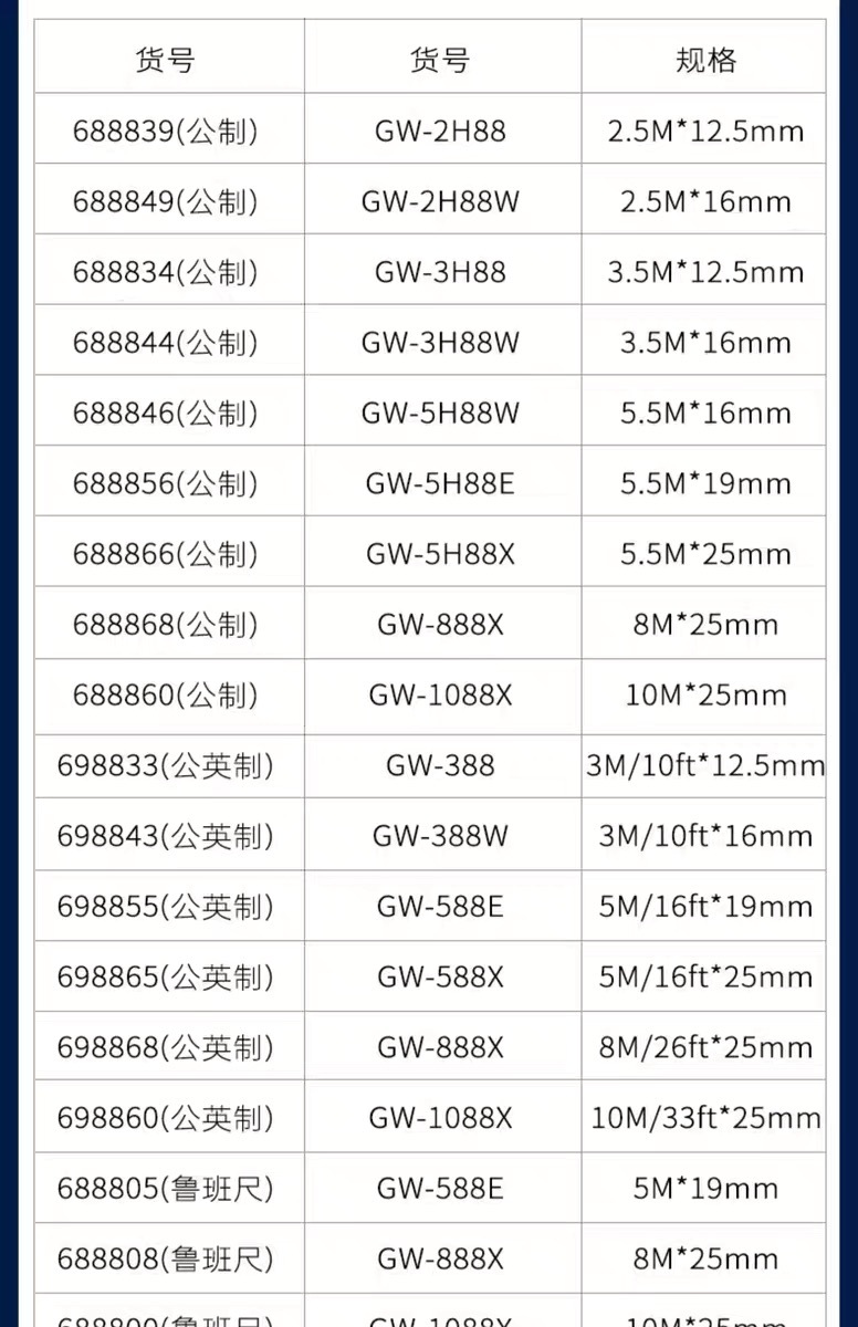 モデル 2.5m*12.5mm (メートル法)688839,2.5m*16mm (メートル法)688849,3.5m*12.5mm (メートル法)688834,3.5m*16mm (メートル法) 688844,5.5m*16mm (メートル法)688846,5.5m*19mm (メートル法)688856,5.5m*25mm (メートル法)688866,8m*25mm (メートル法)688868,10m*25mm (メートル法)688860,3m*12.5mm (メートル法およびインチ法)698833,3m*16mm (メートル法およびインチ法)698843,5m*19mm (メートル法およびインチ法)698855,5m*25mm (メートル法およびインチ法)698865,8m*25mm (メートル法およびインチ法)698868,10m*25mm (メートル法およびインチ法)698860,5m*19mm (ルバン定規)688805,8m*25mm (ルバン定規)688808,10m*25mm (ルバン定規)688800