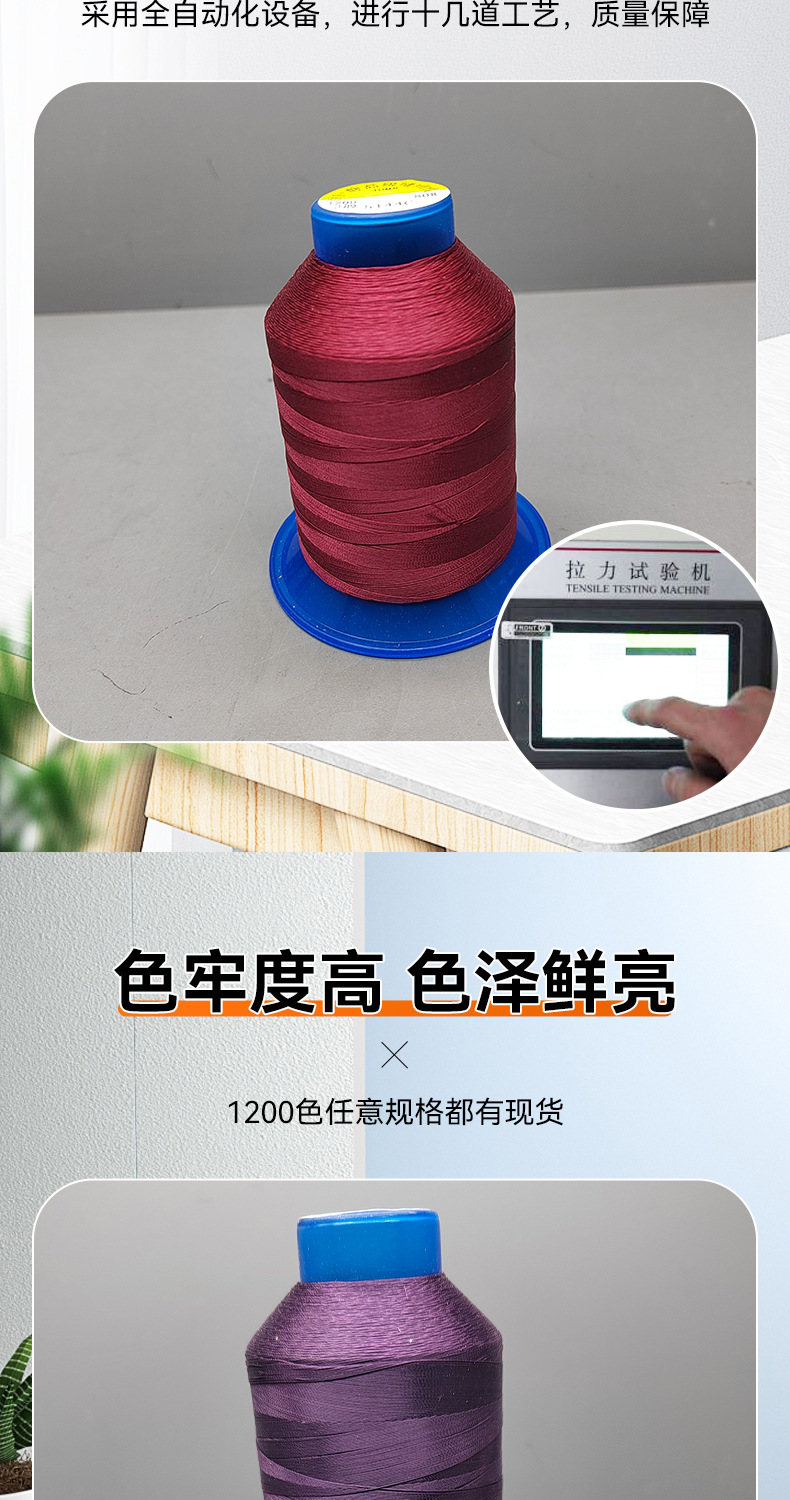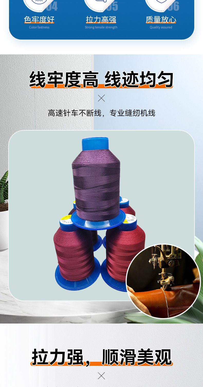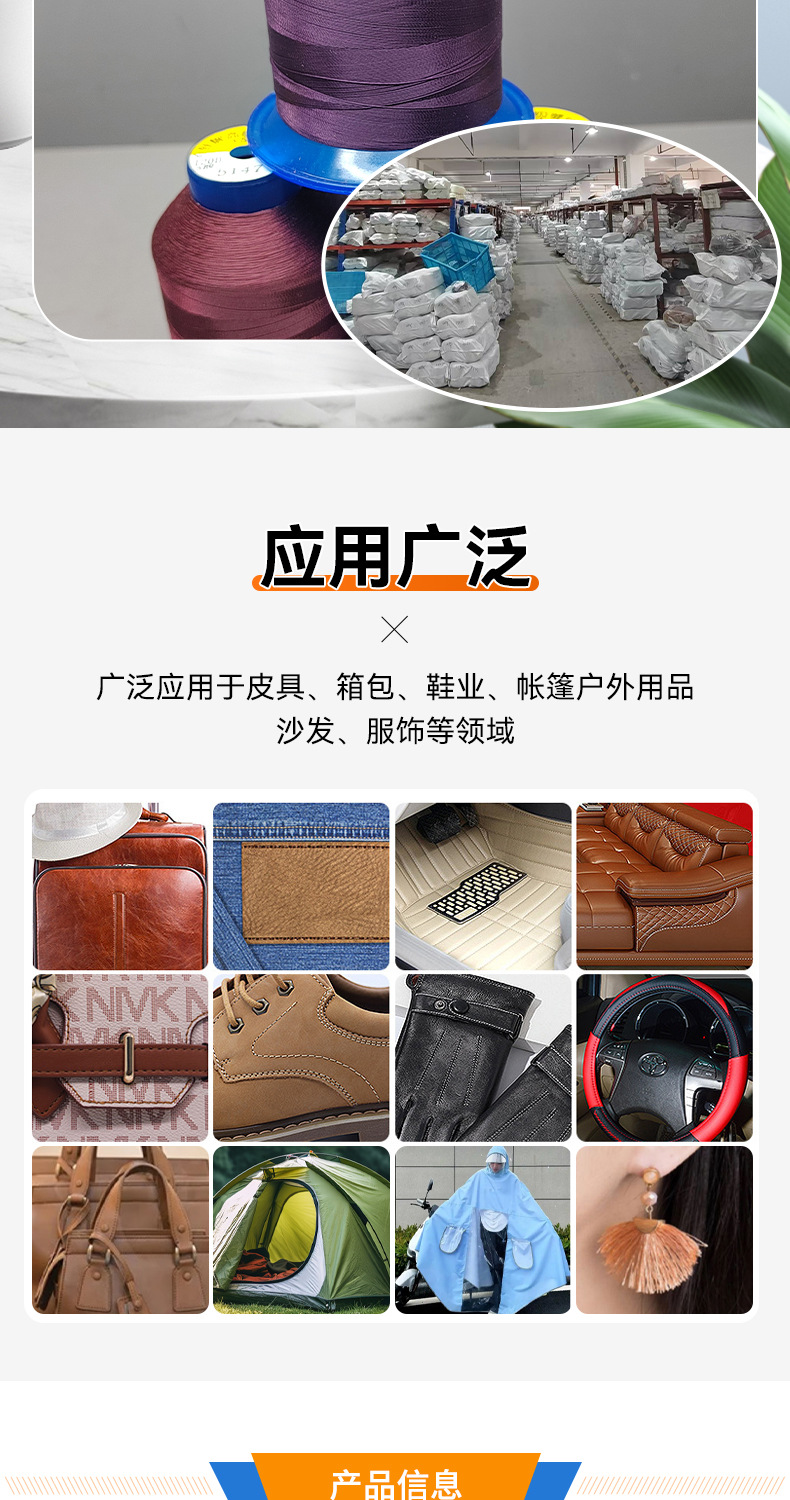 トレインヘッド百針工場は、高強度シルク縫い糸、衣類、テント用150D/3丸頭ベルト・革靴用糸を供給しています。