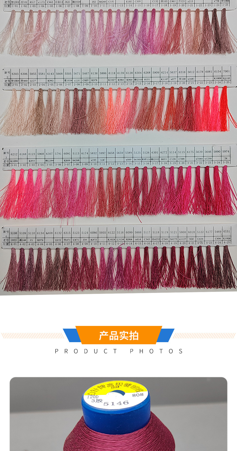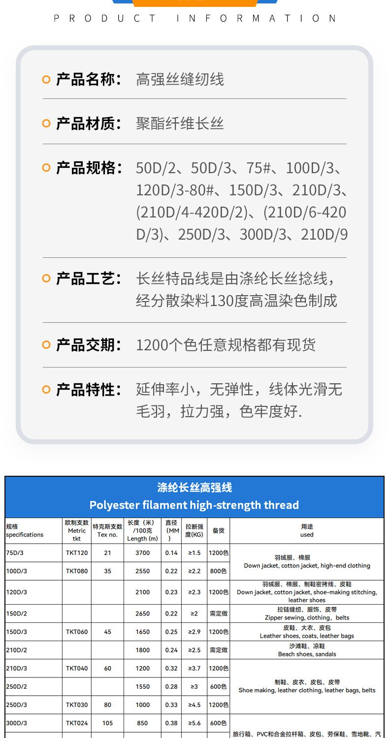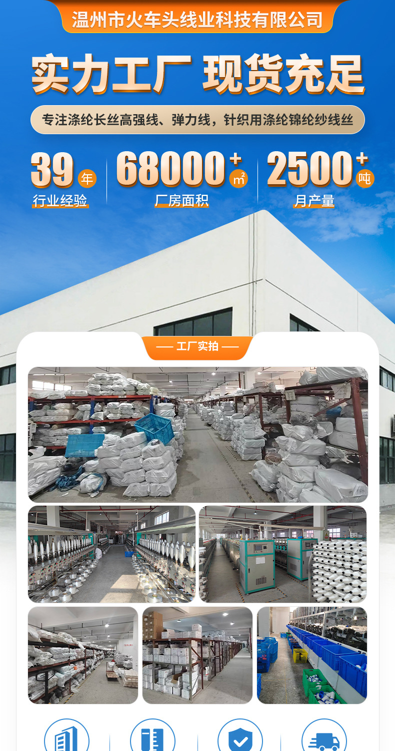 トレインヘッド百針工場は、高強度シルク縫い糸、衣類、テント用150D/3丸頭ベルト・革靴用糸を供給しています。