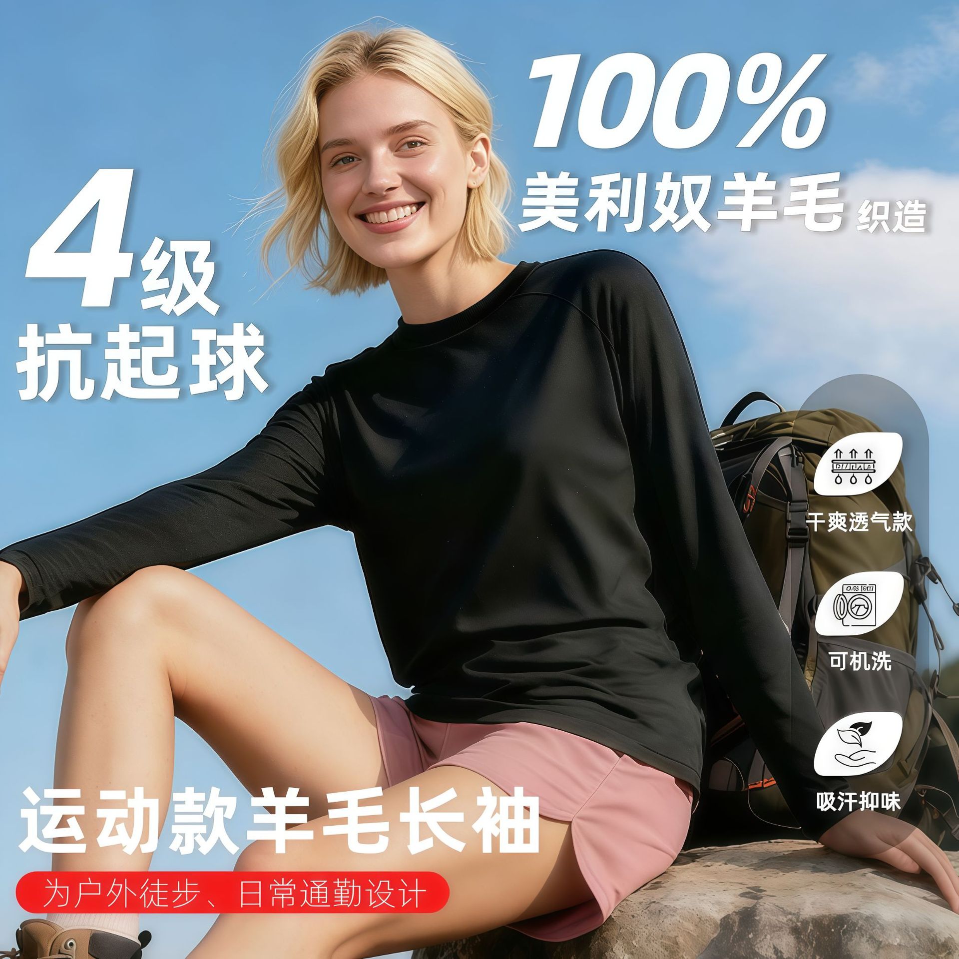 17.5微米美利奴羊毛速干衣女户外徒步登山瑜伽保暖美丽诺长袖时尚