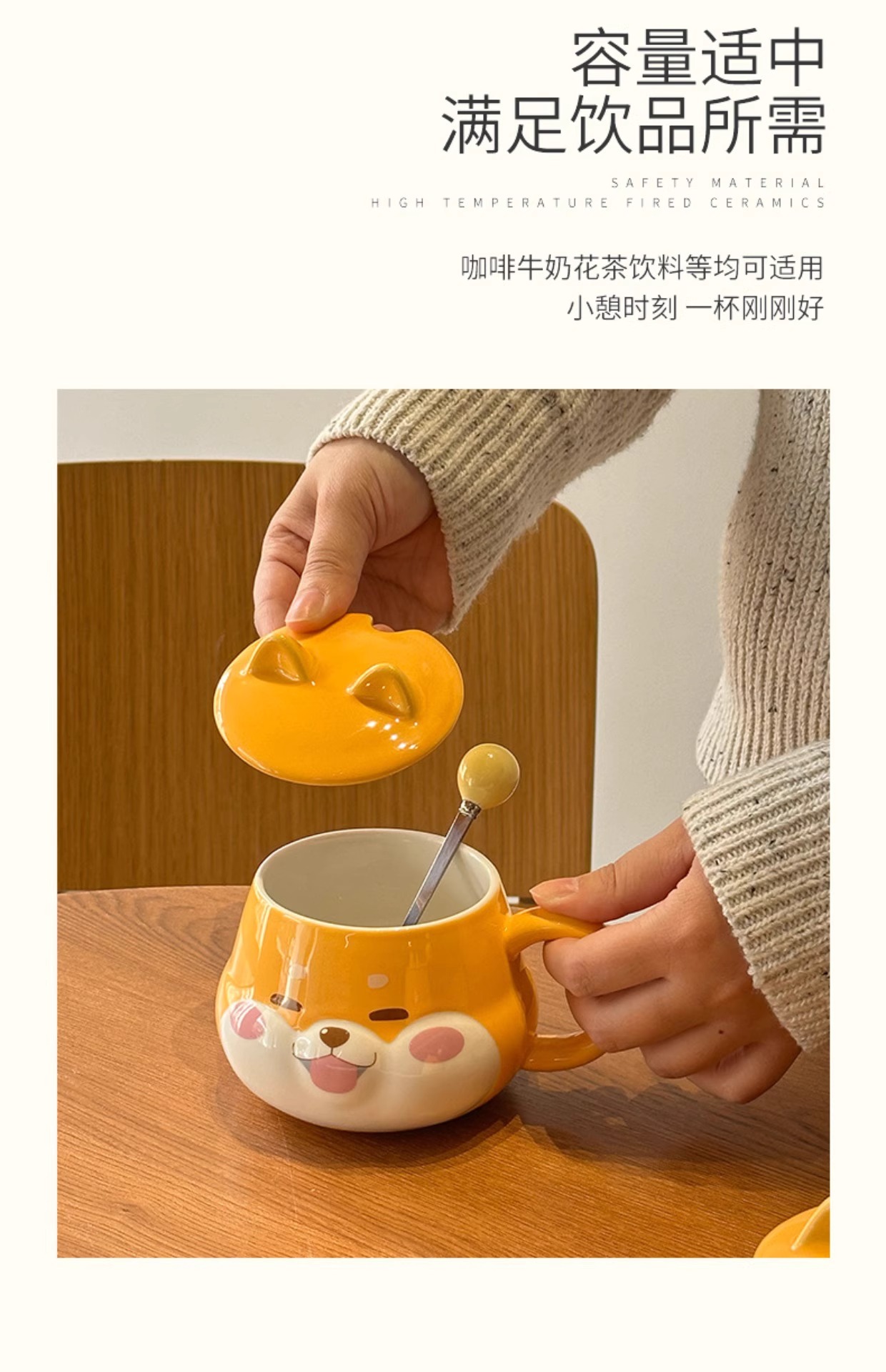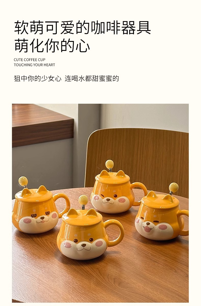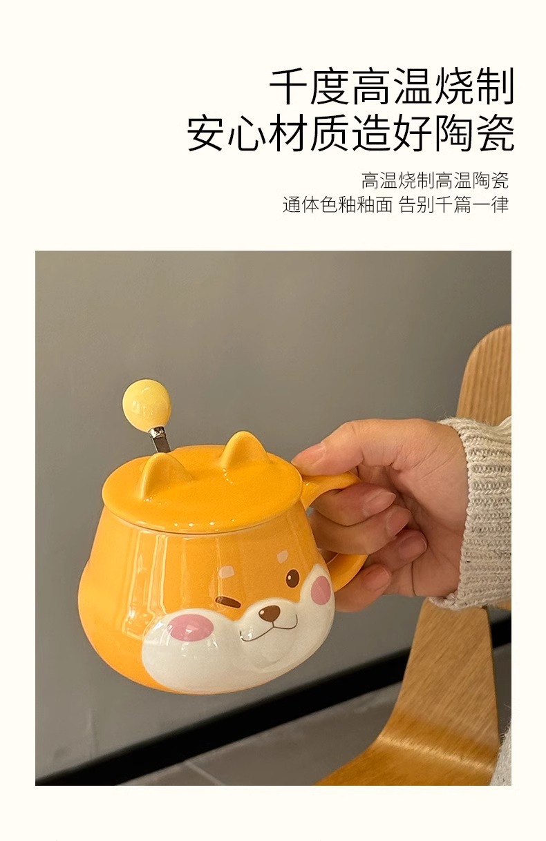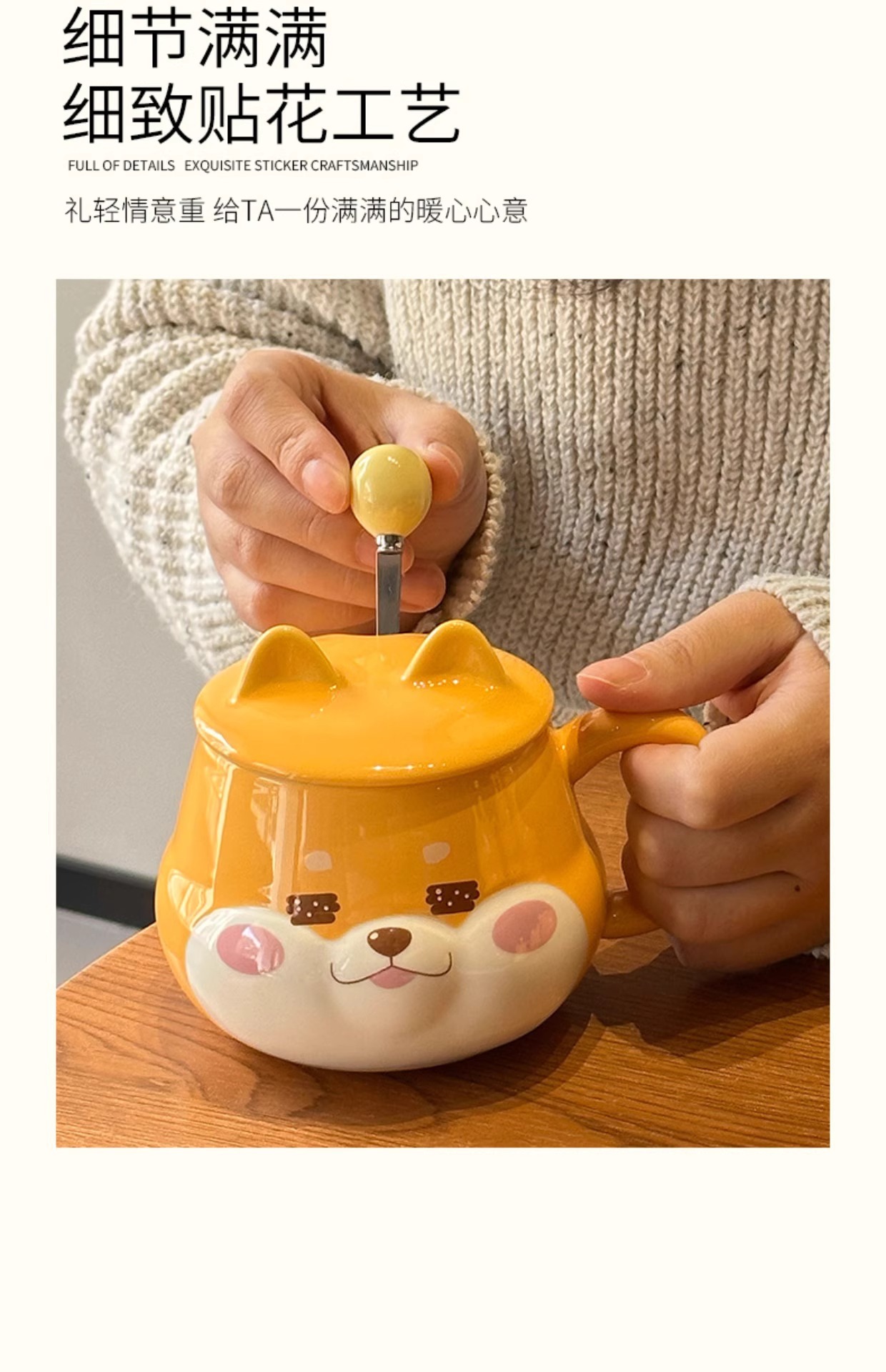 高颜值卡通柴犬陶瓷带盖马克杯居家办公校园必备生日礼物儿童杯
