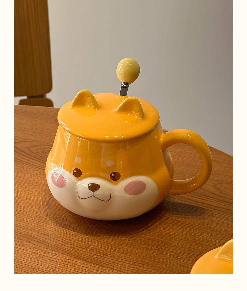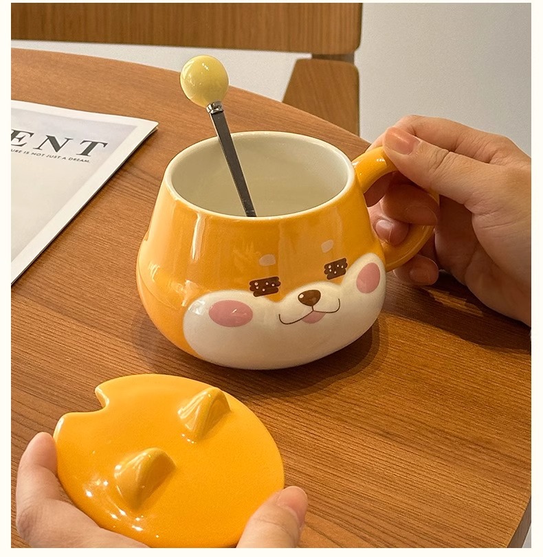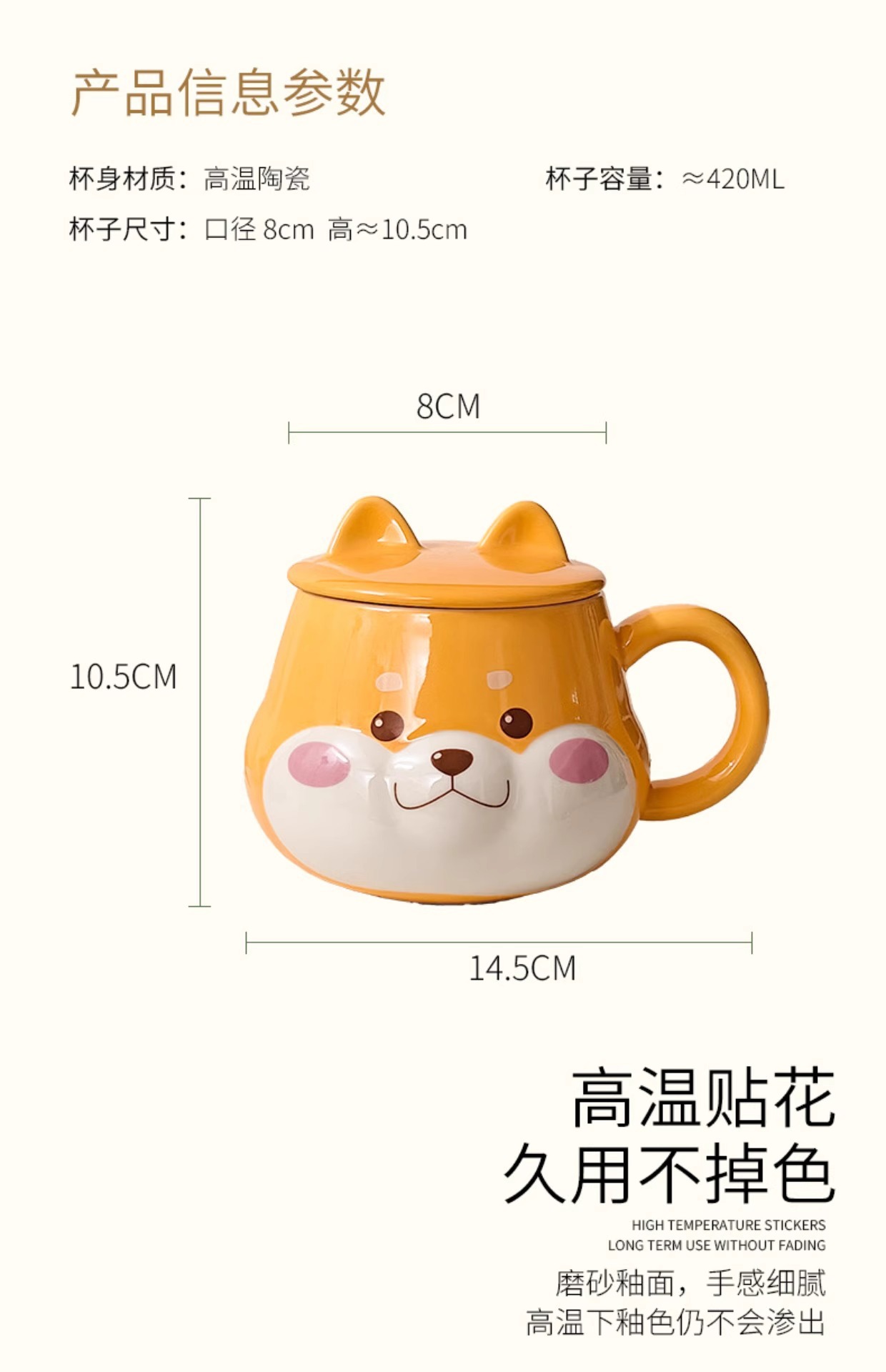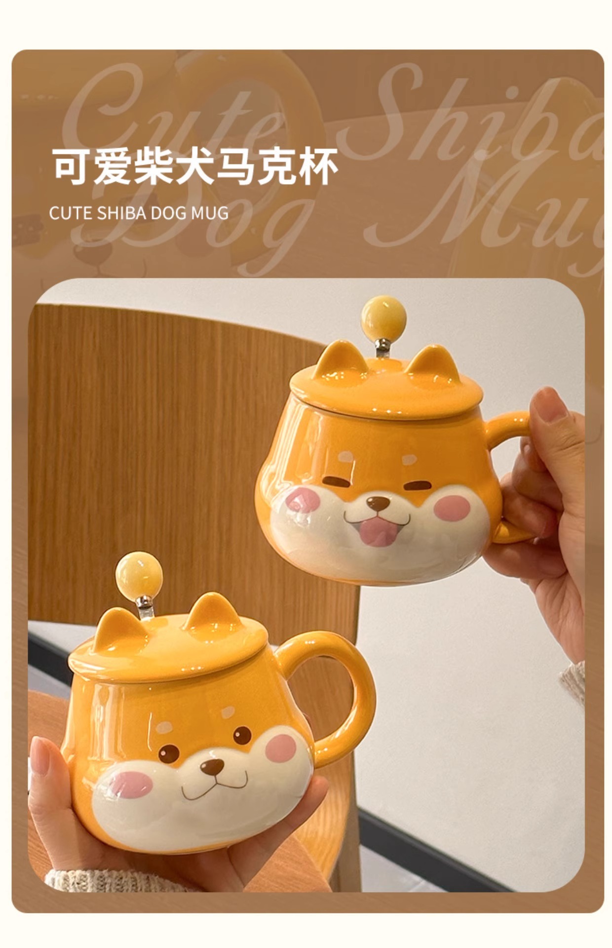 高颜值卡通柴犬陶瓷带盖马克杯居家办公校园必备生日礼物儿童杯