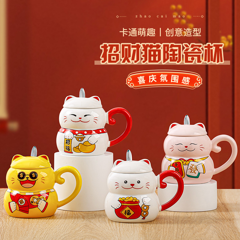 新年の創意招き猫陶磁器カップ春節プレゼントかわいい漫画マグカップ蓋付きスプーン家庭用コップ