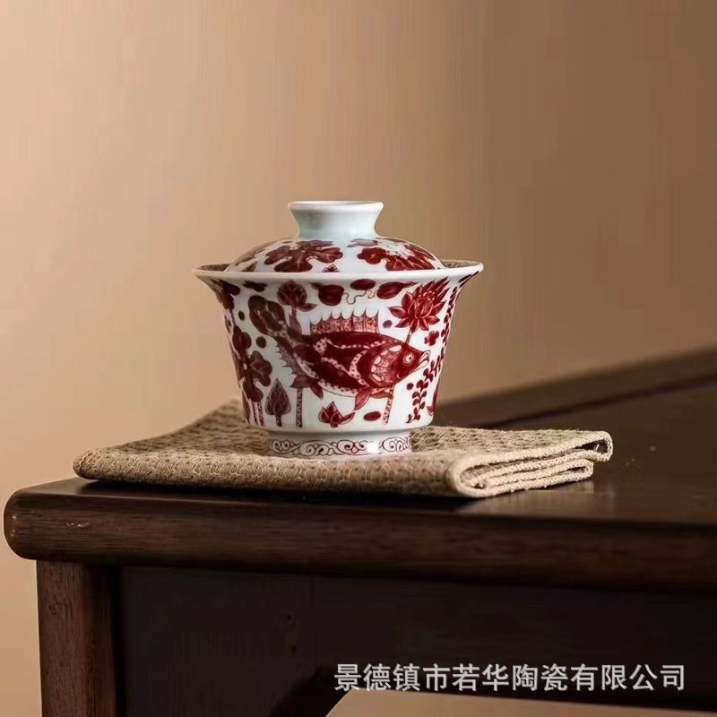 景徳鎮の陶磁器の釉薬の中で赤い魚の藻の紋様は碗の壺をかぶせて主人の杯の工夫の茶器の家庭用の個人を被って古の泥の釉薬をまねます。