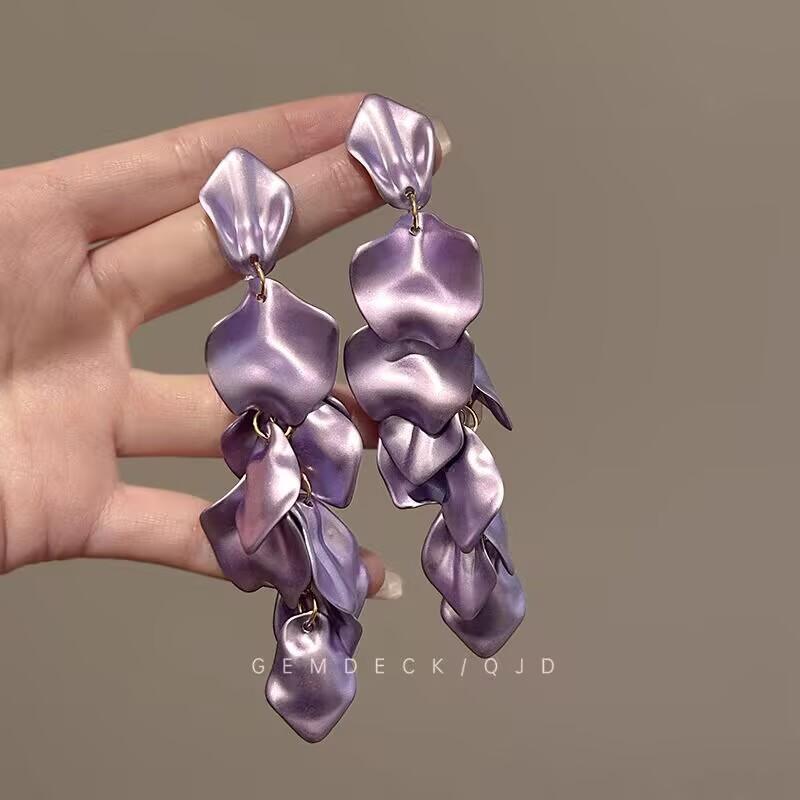 超仙の紫色のしわの花びらのフリンジイヤリングの小さい大衆の復古の軽い贅沢な雰囲気感の長いタイプのイヤリングのイヤリングのイヤリングの女性