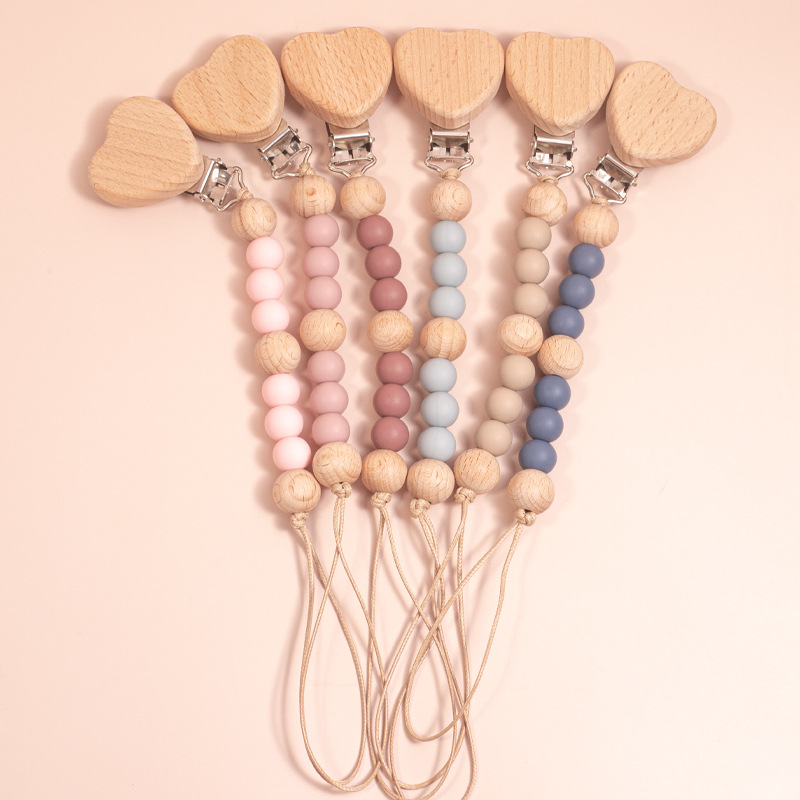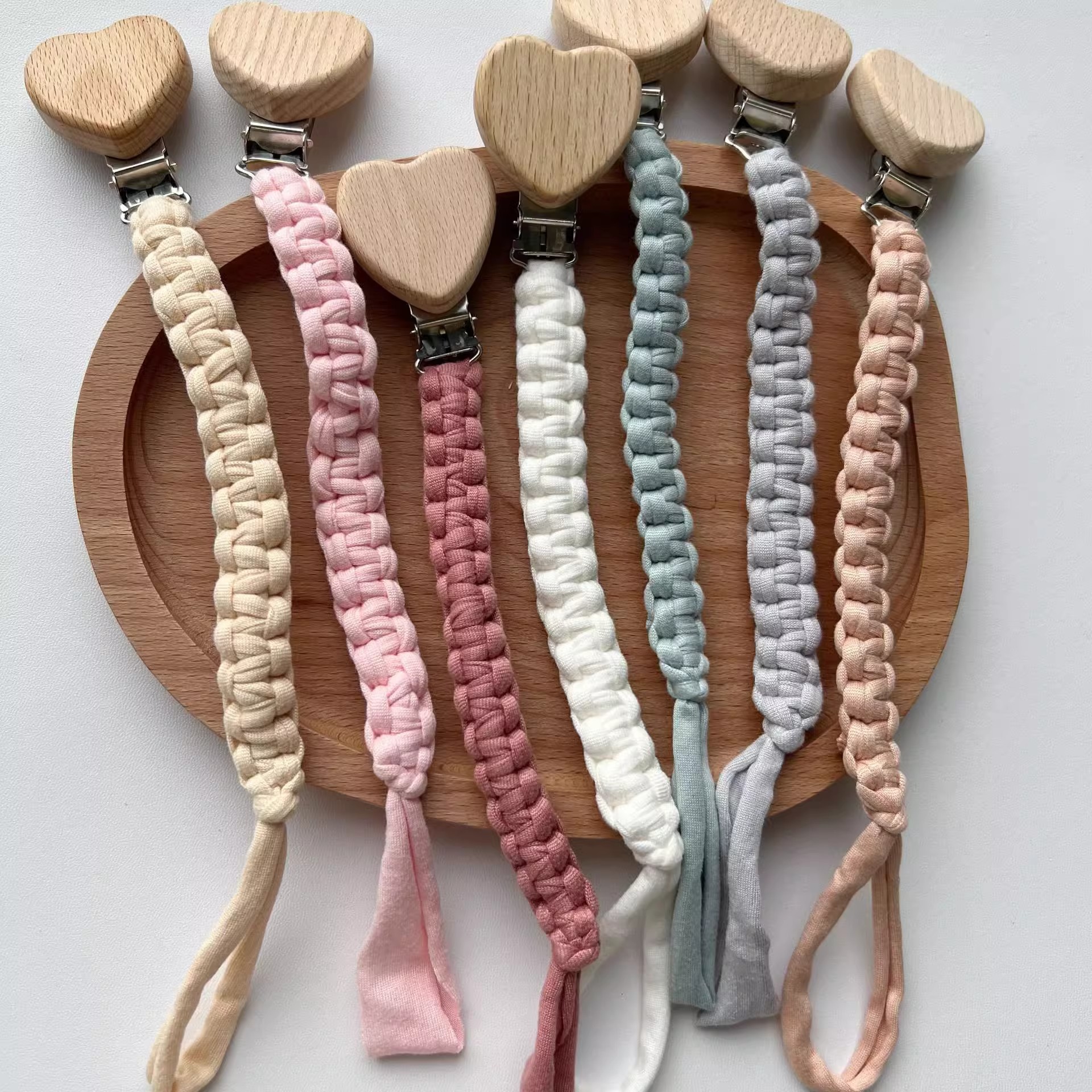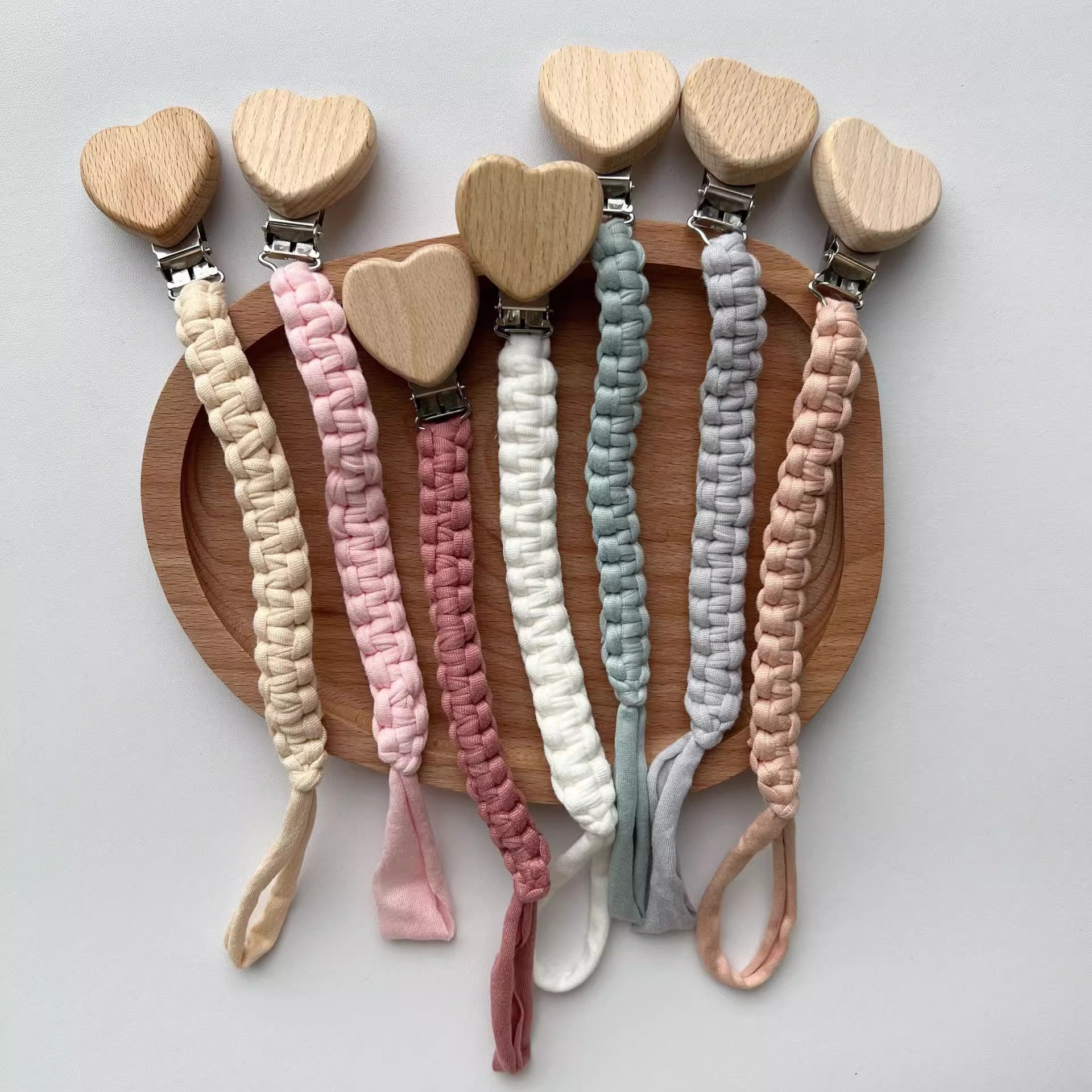 纯手工编制的奶嘴挂绳加上朴质大方的爱心木夹
