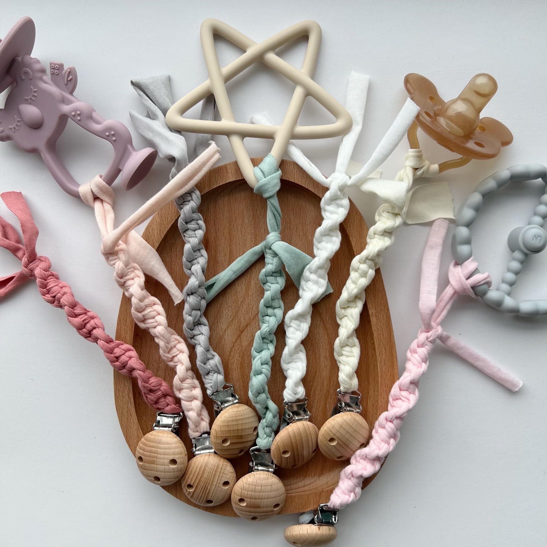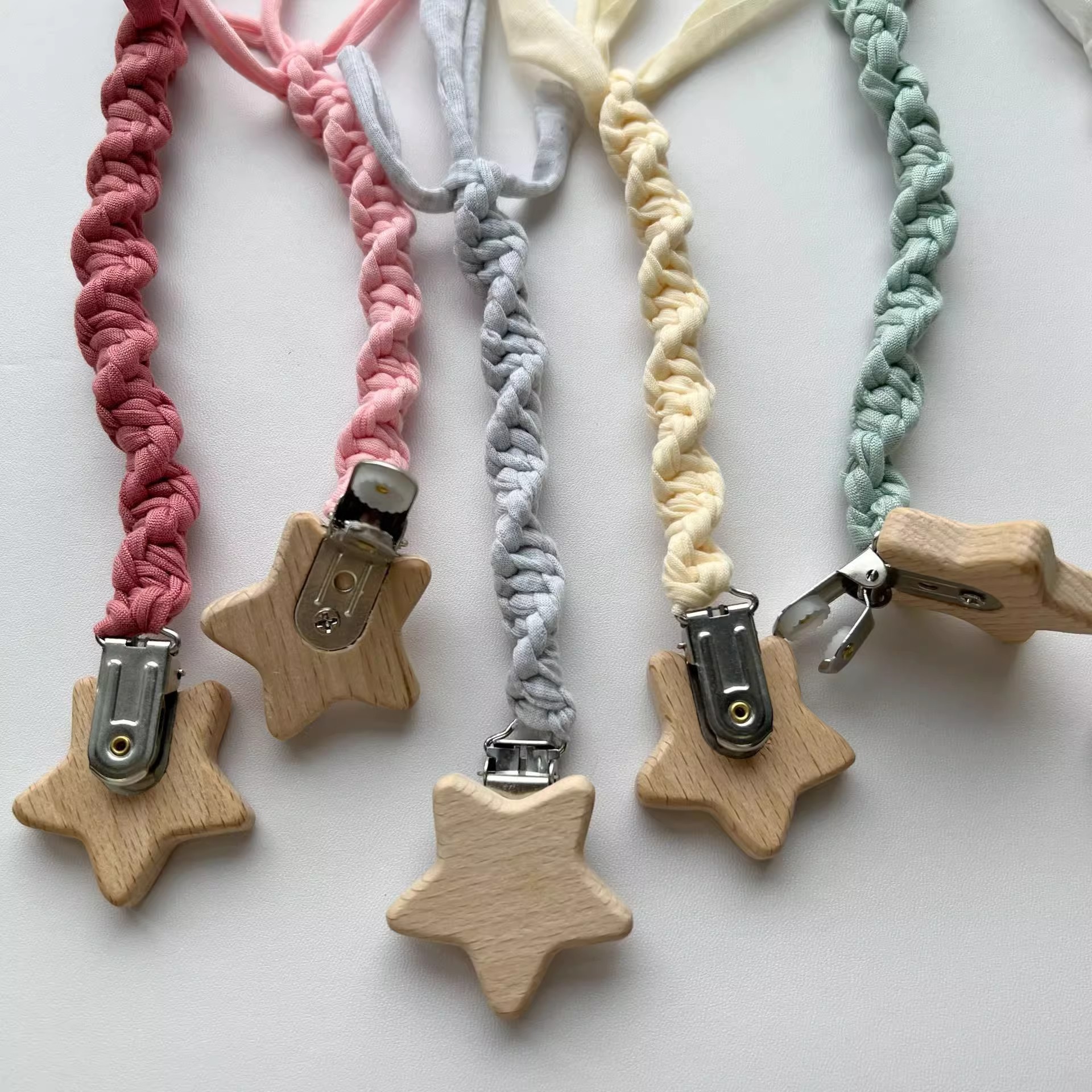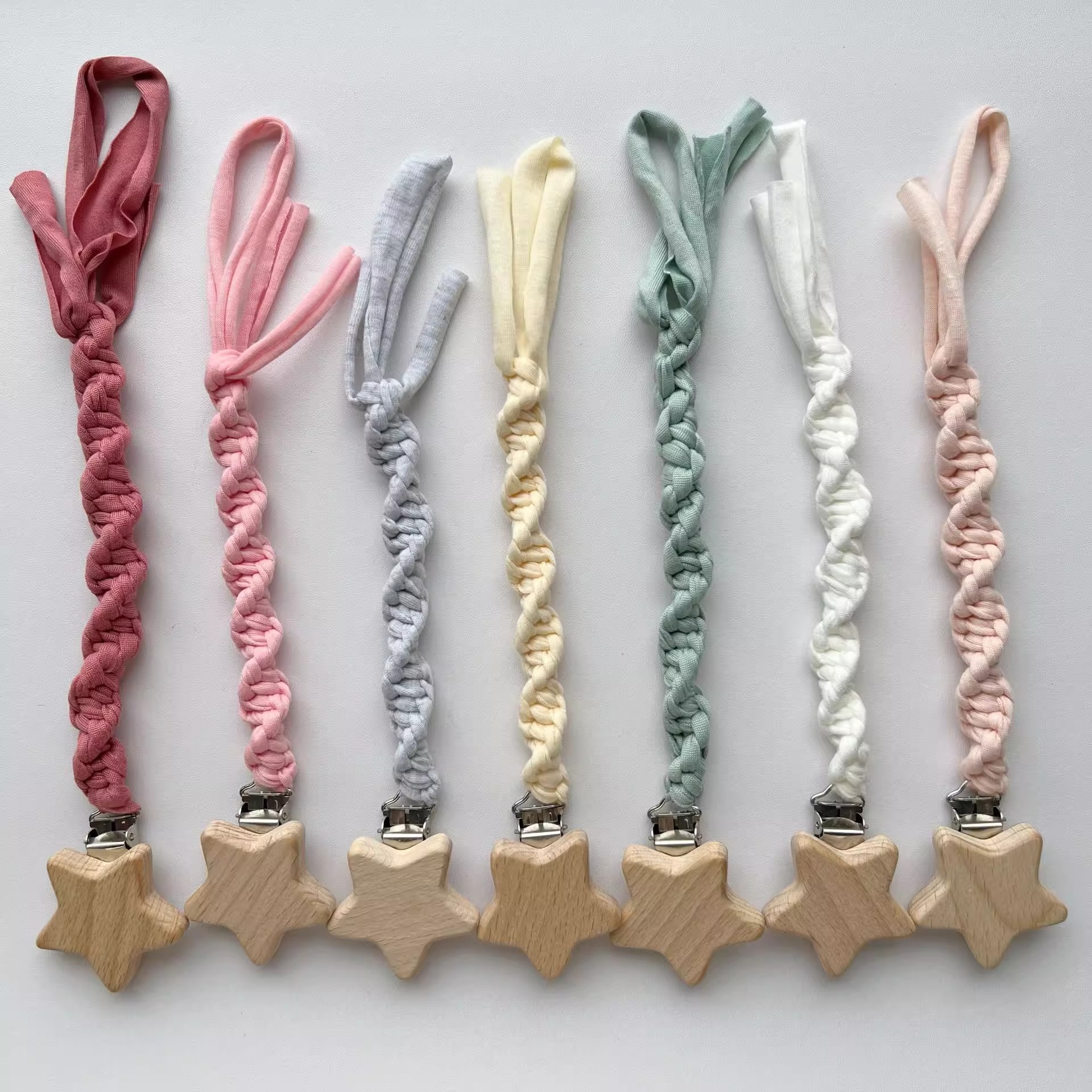 纯手工编制的奶嘴挂绳加上朴质大方的爱心木夹