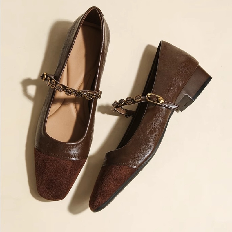 金属チェーンの四角い頭のメアリー珍靴の女性は、太くて羊の皮に合わせた靴と茶色の靴をつなぎ合わせています