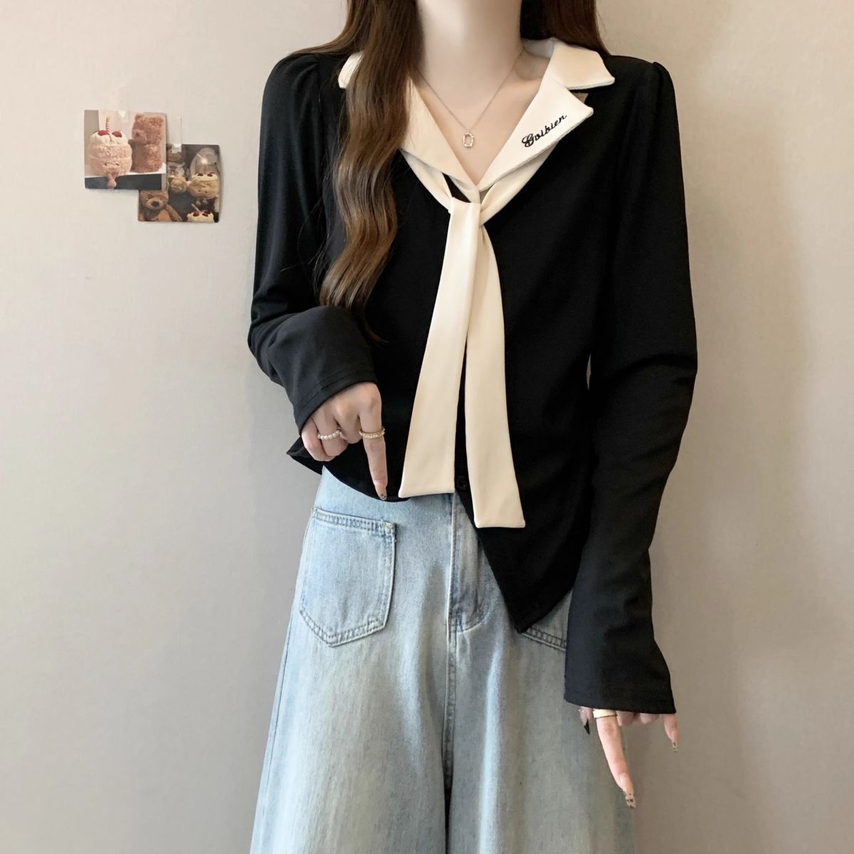 大码撞色正肩翻领长袖T恤女秋季2025新款胖mm修身显瘦遮肉上衣女