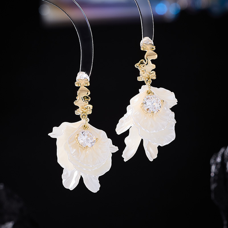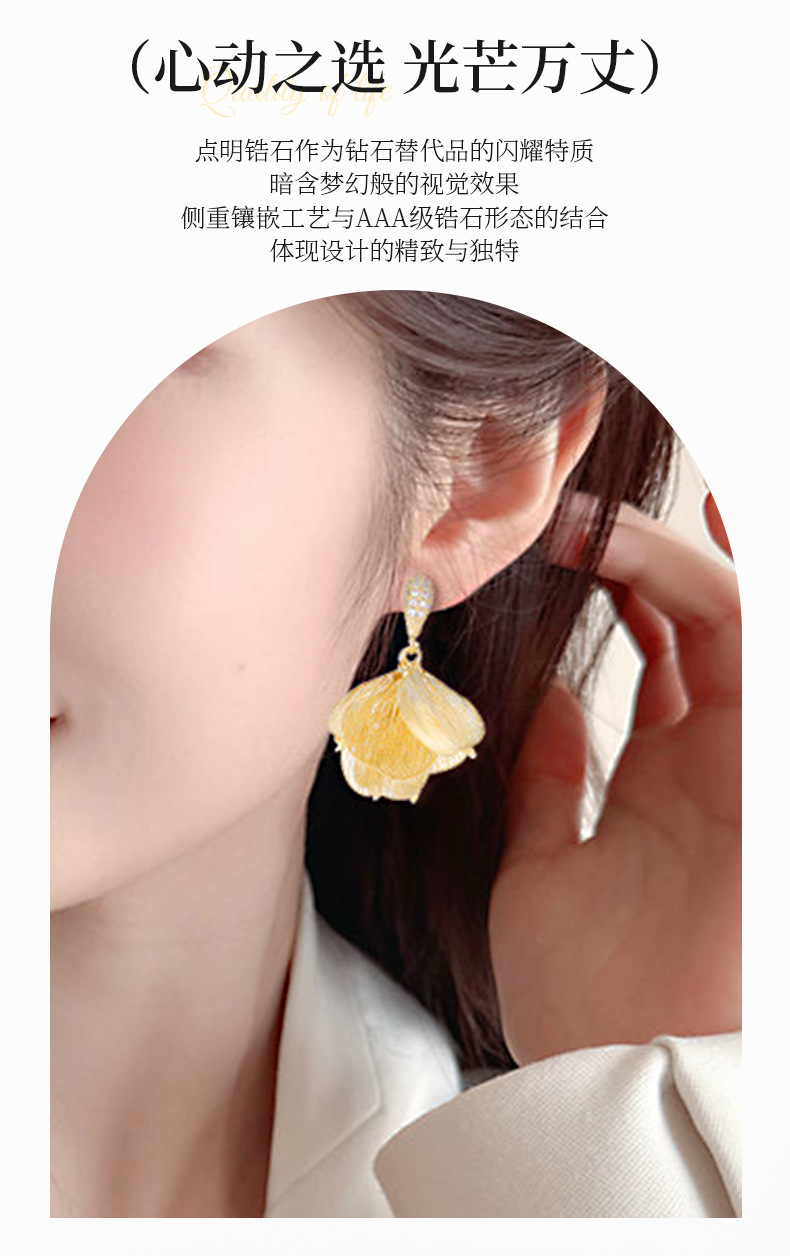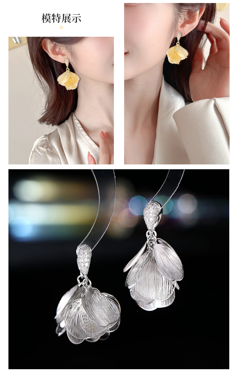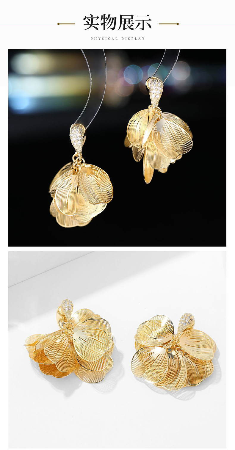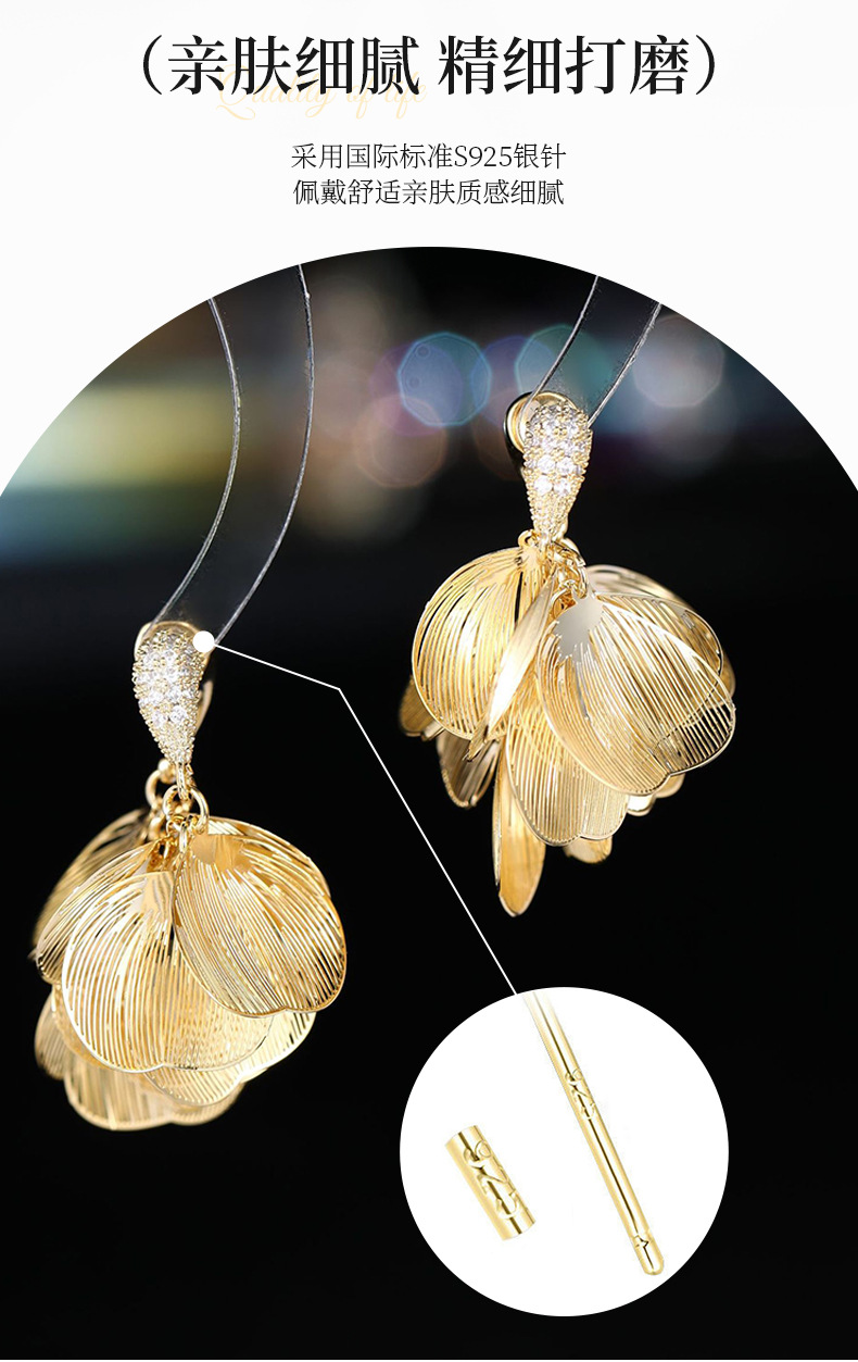 S925銀針フランス超仙伸糸大花びらジルコンイヤリング小衆デザイン軽贅沢後吊り式ファッション耳飾り