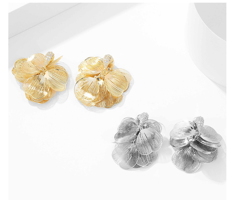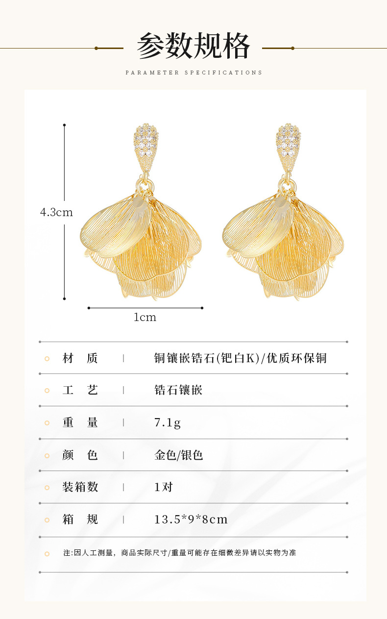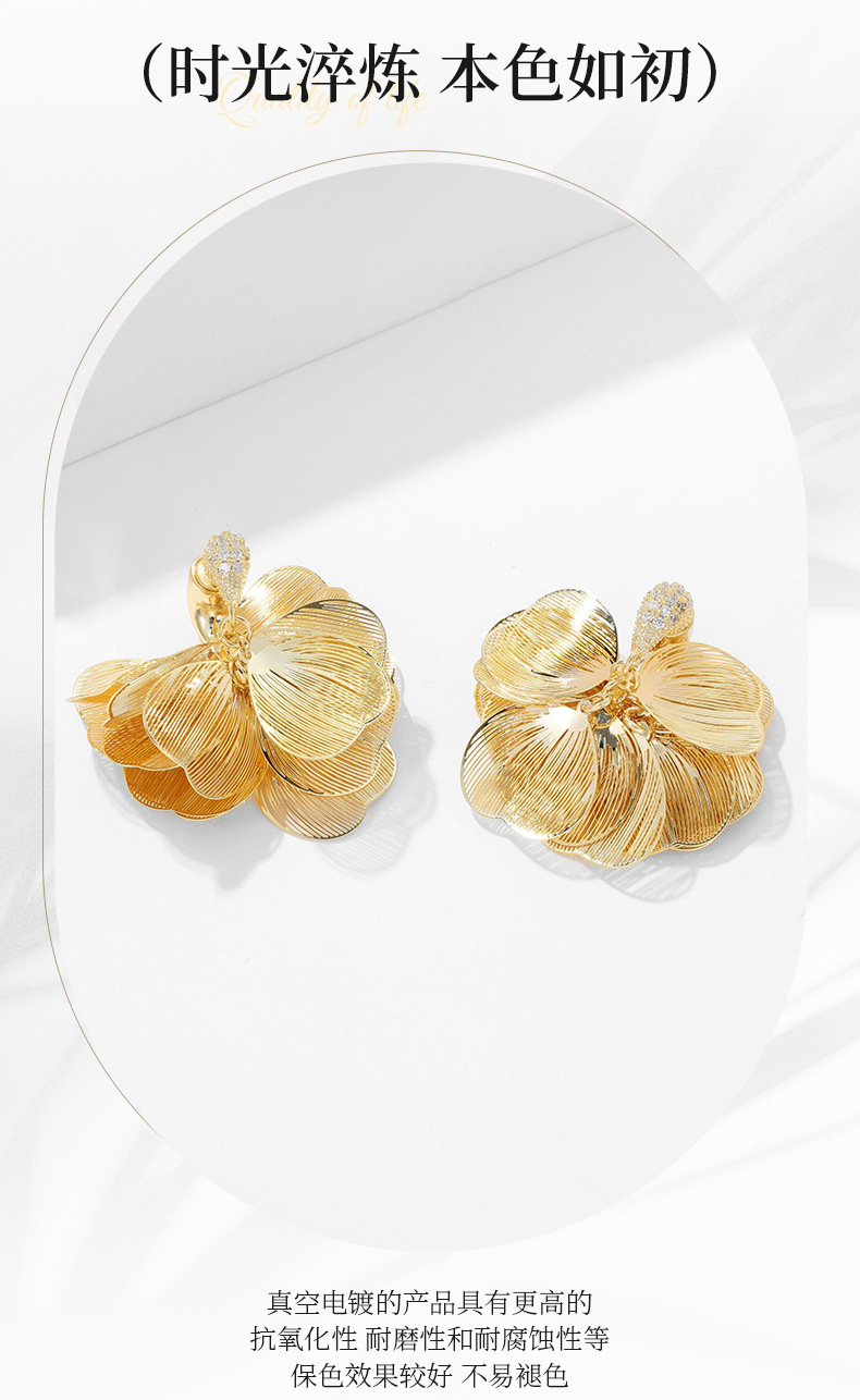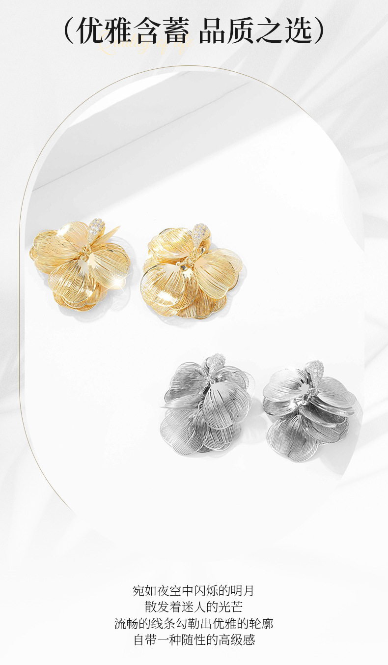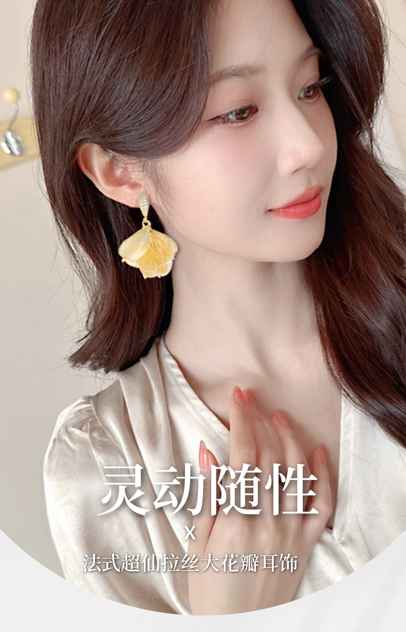 S925銀針フランス超仙伸糸大花びらジルコンイヤリング小衆デザイン軽贅沢後吊り式ファッション耳飾り