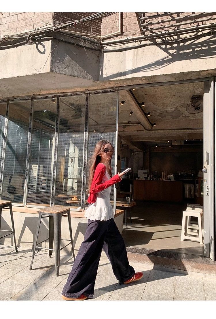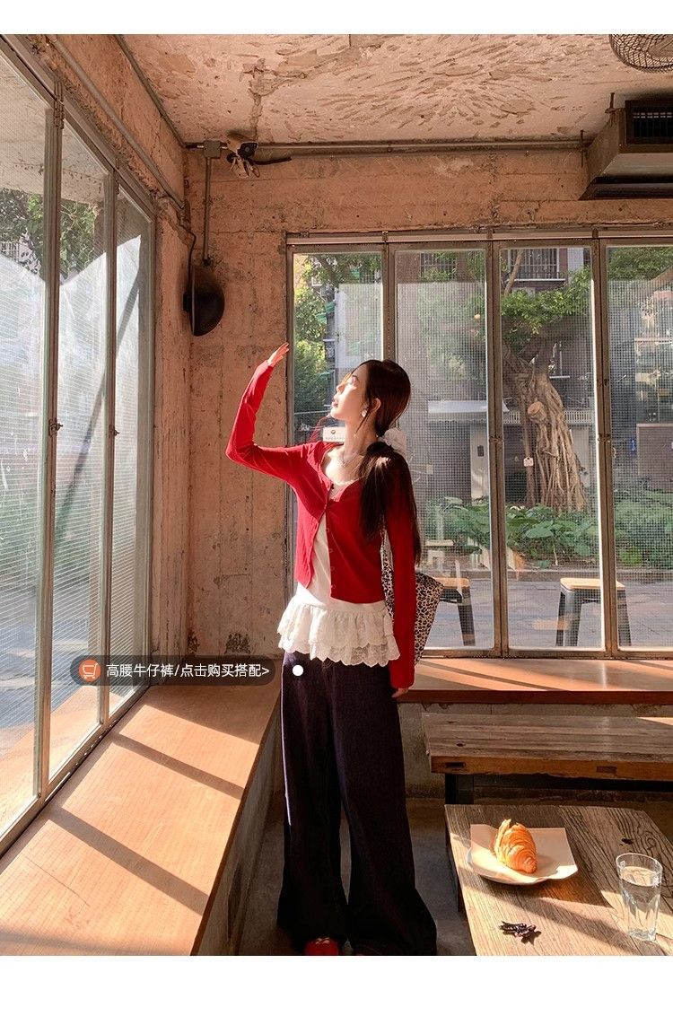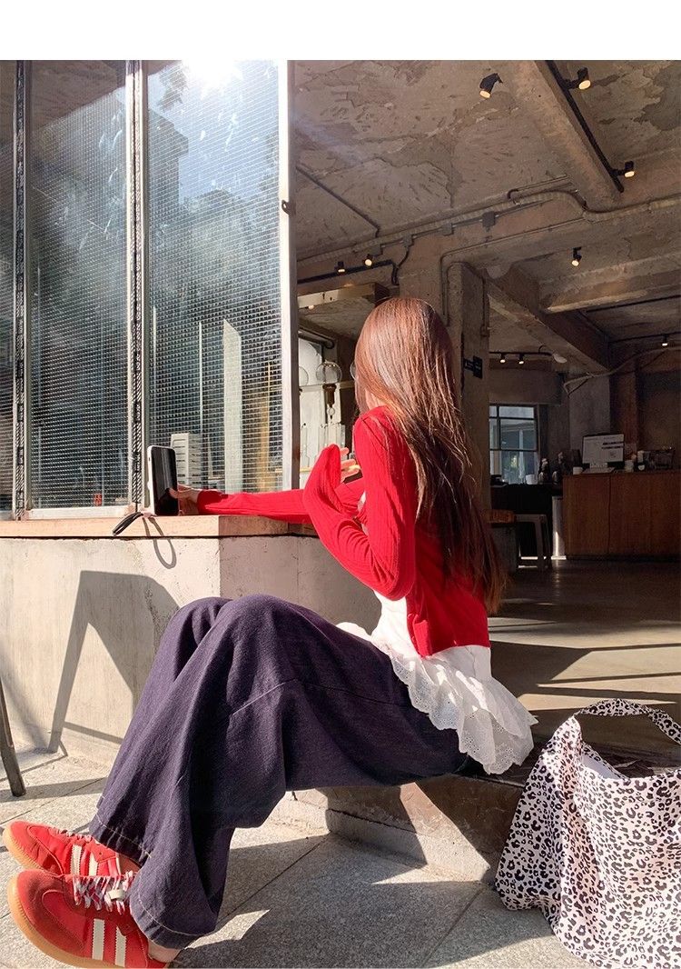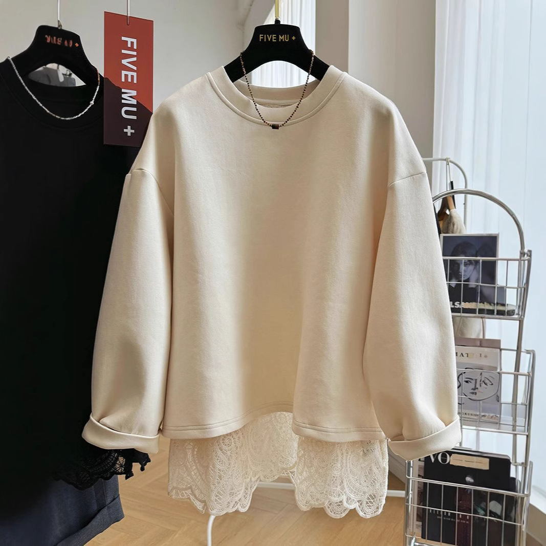 2024新型レースは偽の2つの頭の丸首のカーディガンの女性の春秋の怠惰な風のアメリカのゆったりした上着をつなぎ合わせます。