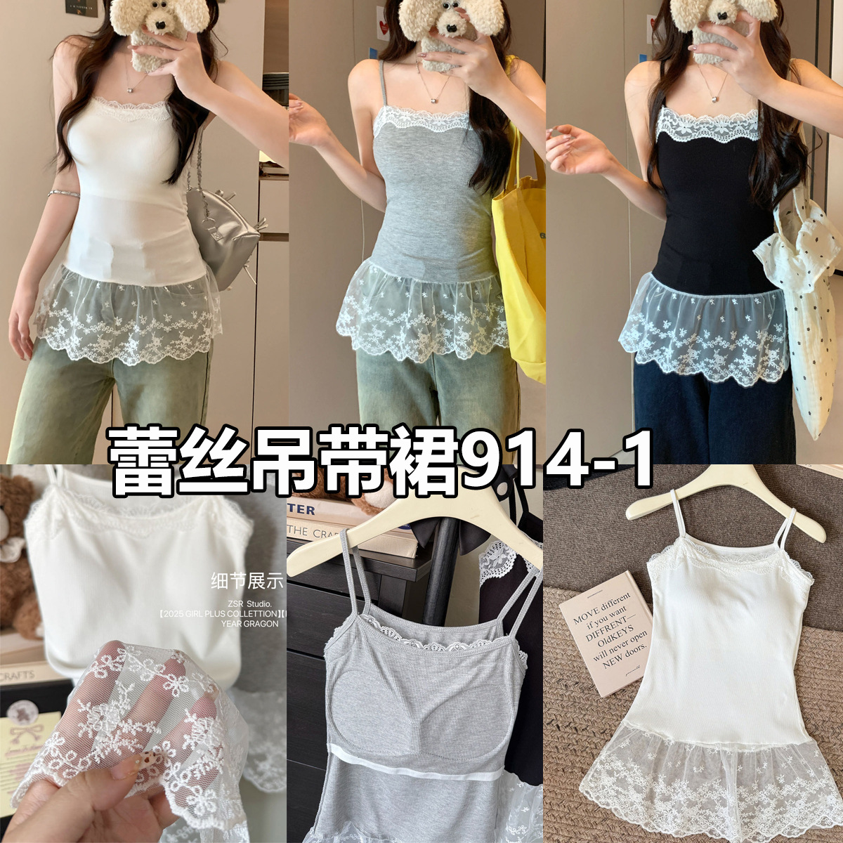 レースの美しいバック裾の女性用キャミソール、2025年春夏の新しいスタイル、美しいトップスを重ねたインナーレイヤリング