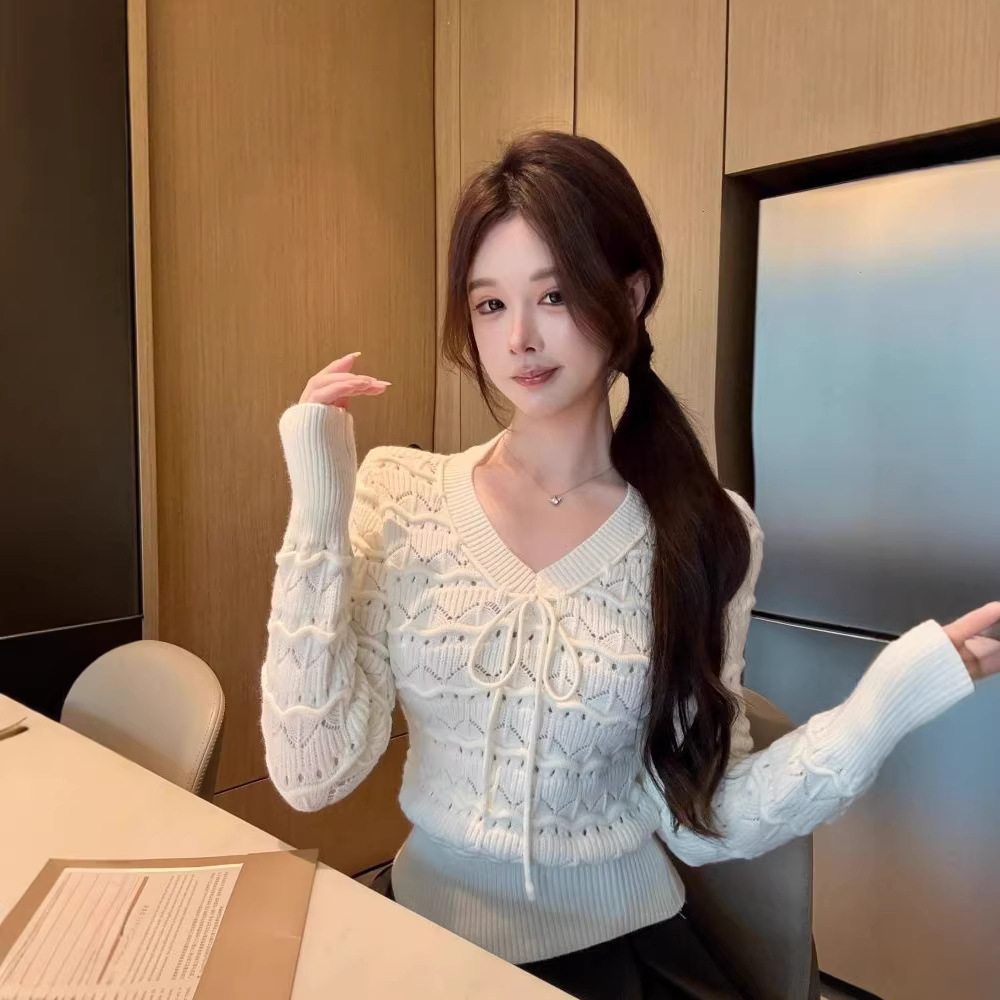 温柔甜美风系带V领长袖针织衫女春秋新款别致减龄显瘦打底衫上衣