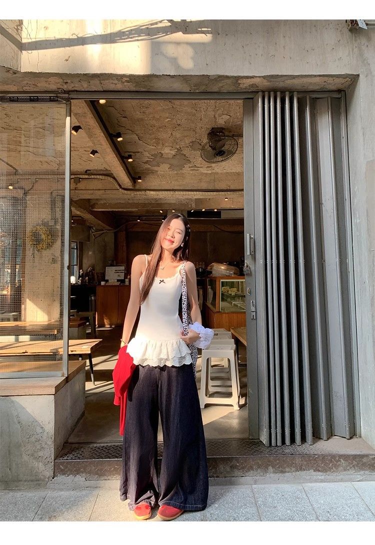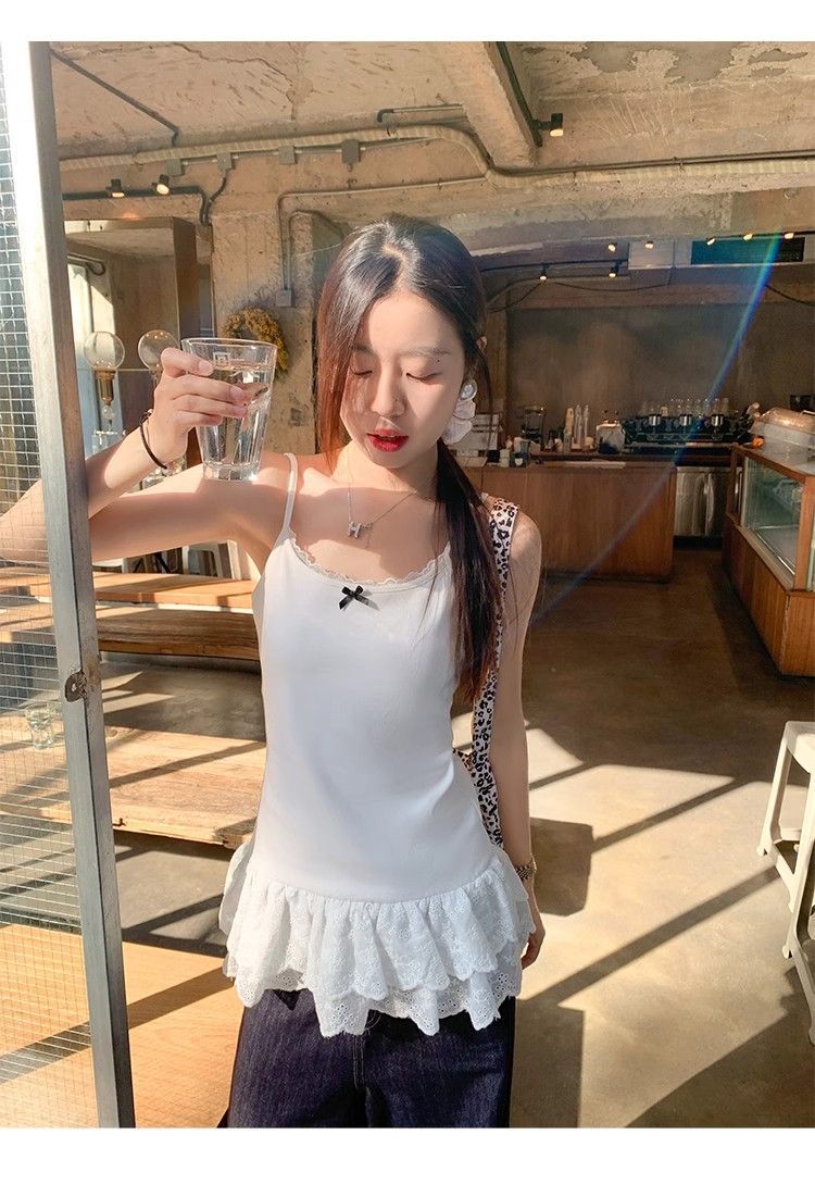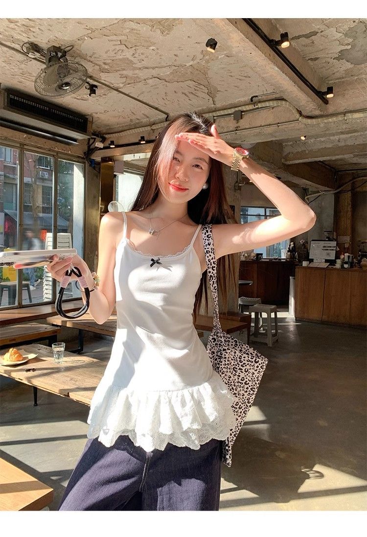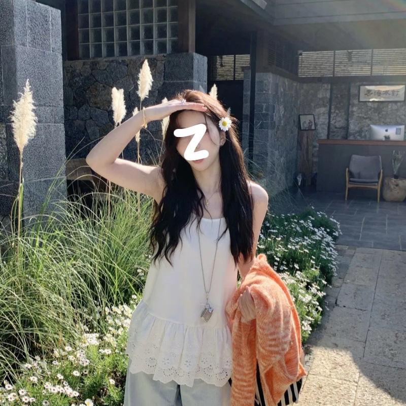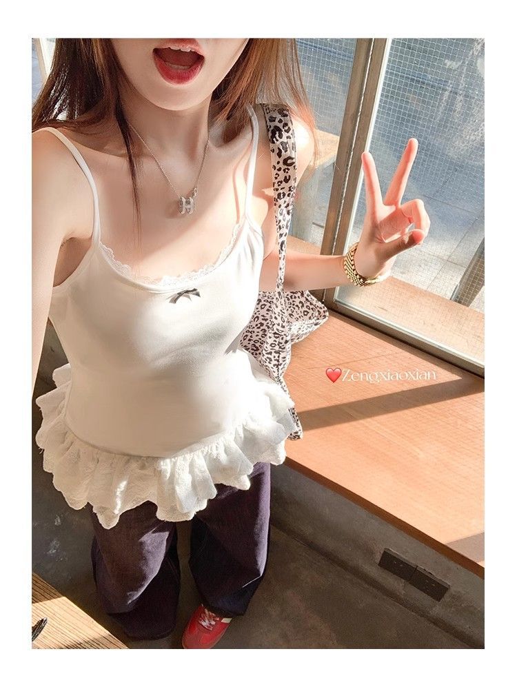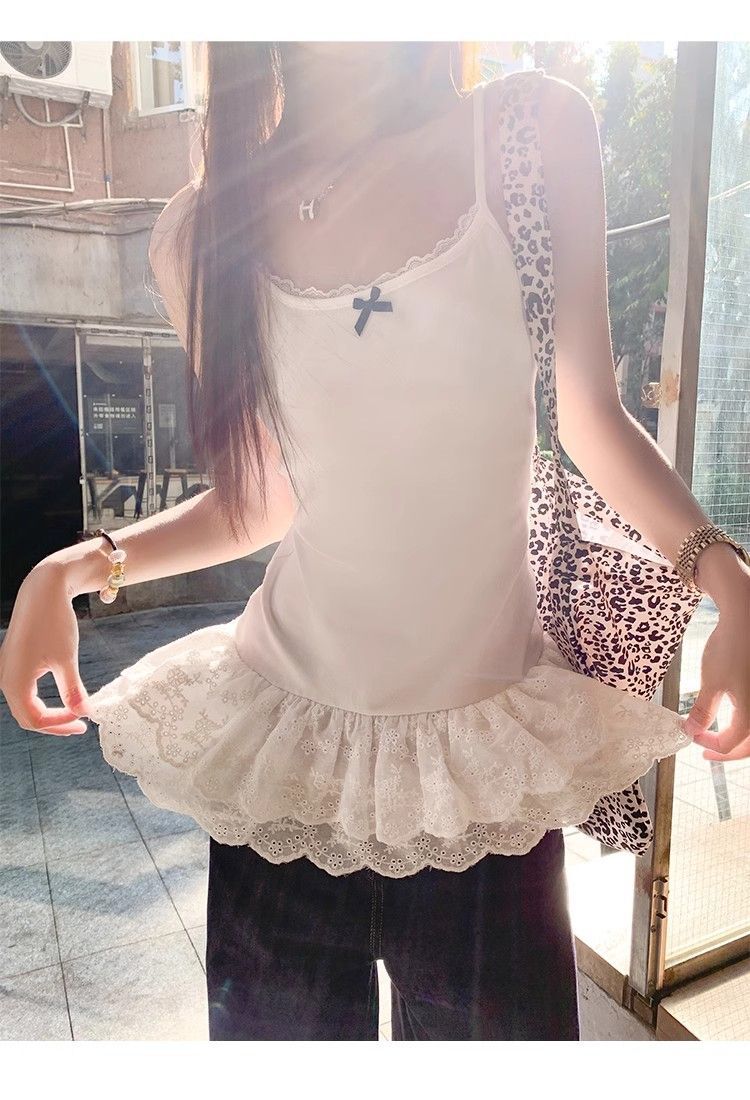 设计感U领下摆蕾丝花边吊带背心女夏季辣妹纯欲风中长款法式上衣