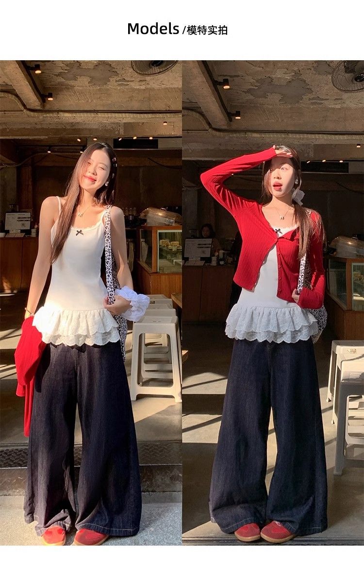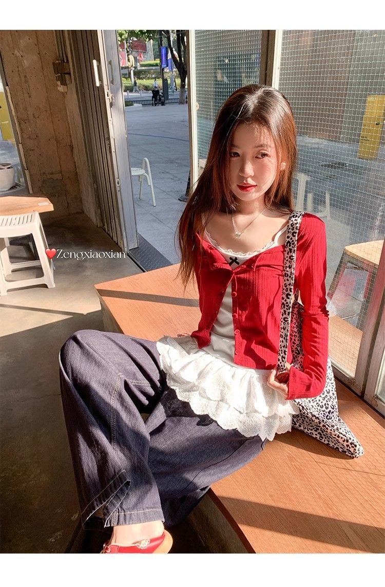 夏の新作の甘いギャルの蝶結びのベストの小さいガーターの女性の春のレースの裾は重ねて上着のファッションを着ます。