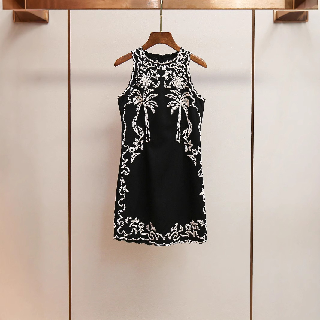 Fadan Mjia 23 新しい夏のレトロな黒の刺繍ノースリーブドレスラウンドネック中空エッセンシャルウエスト A ラインスカート