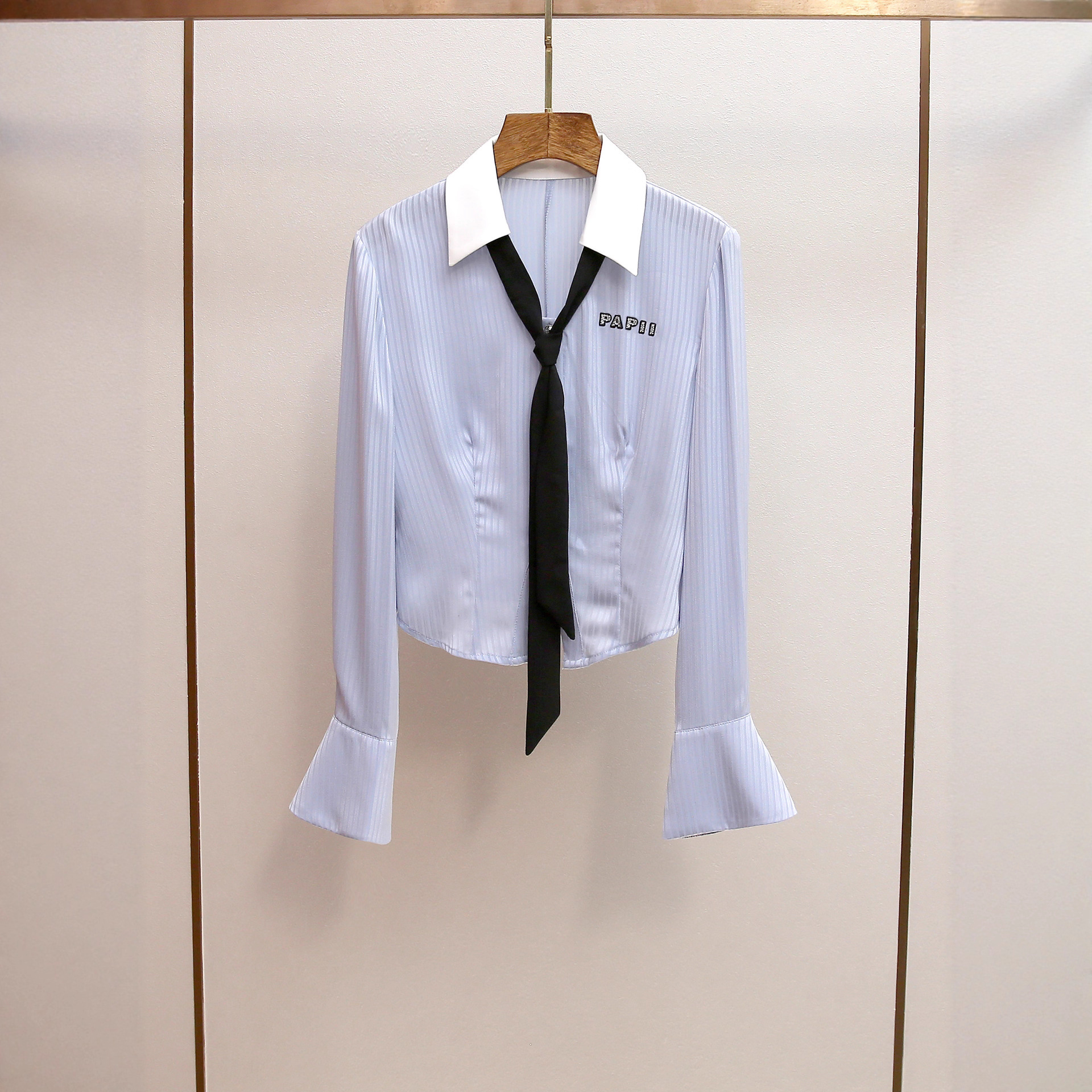 深圳南油高端女装秋季新款韩系减龄学院风系带翻领喇叭袖条纹衬衫