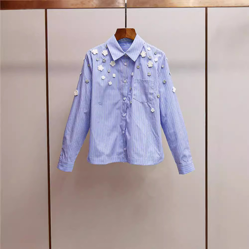深セン南油高級女装ファッション文芸韓系立体花釘ドリル襟長袖縞シャツ上着