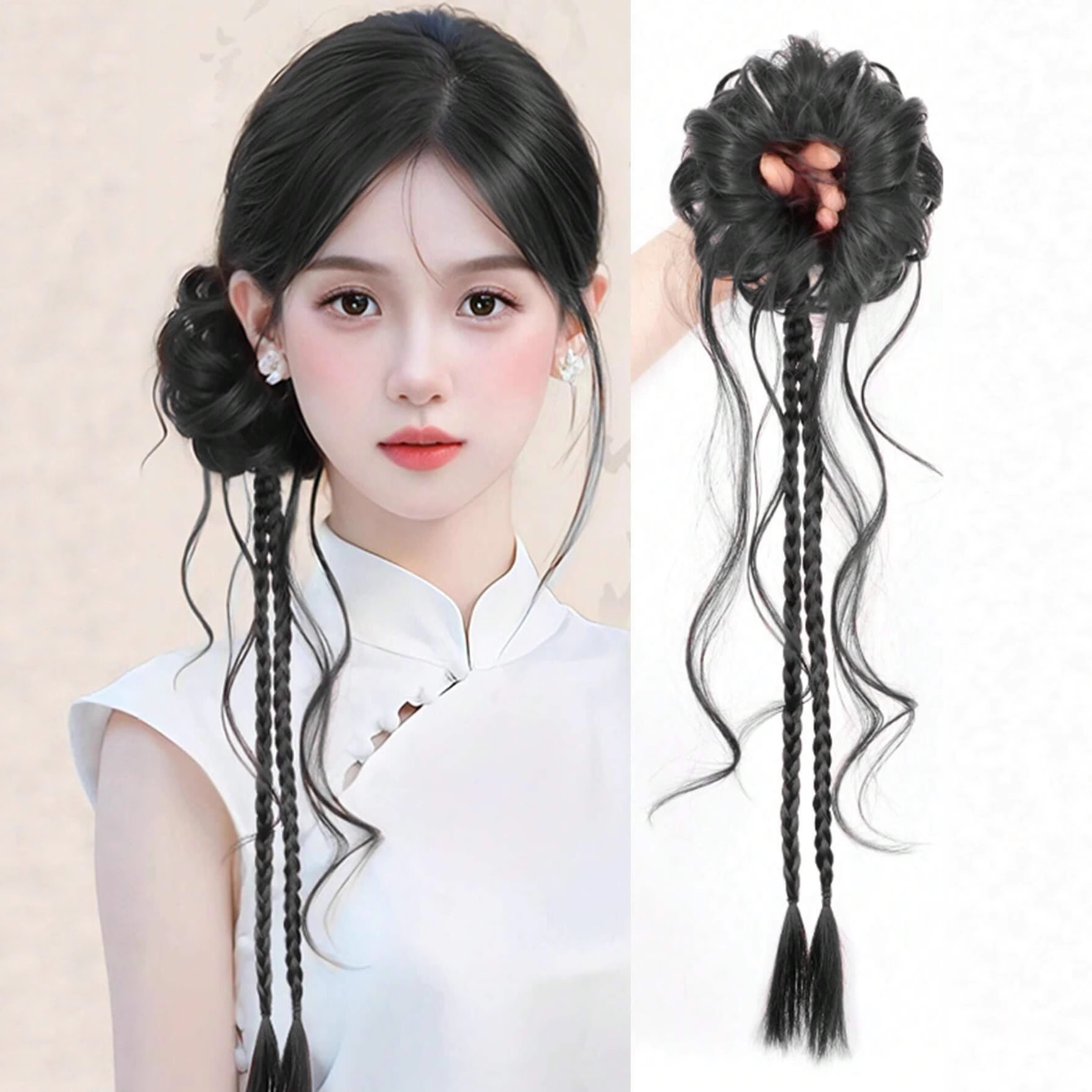 丸子ヘアウィッグ、女性用ふわふわナチュラルヘアリング、龍ひげ丸子、半結びロングヘア、麻ひもボクシングブレード