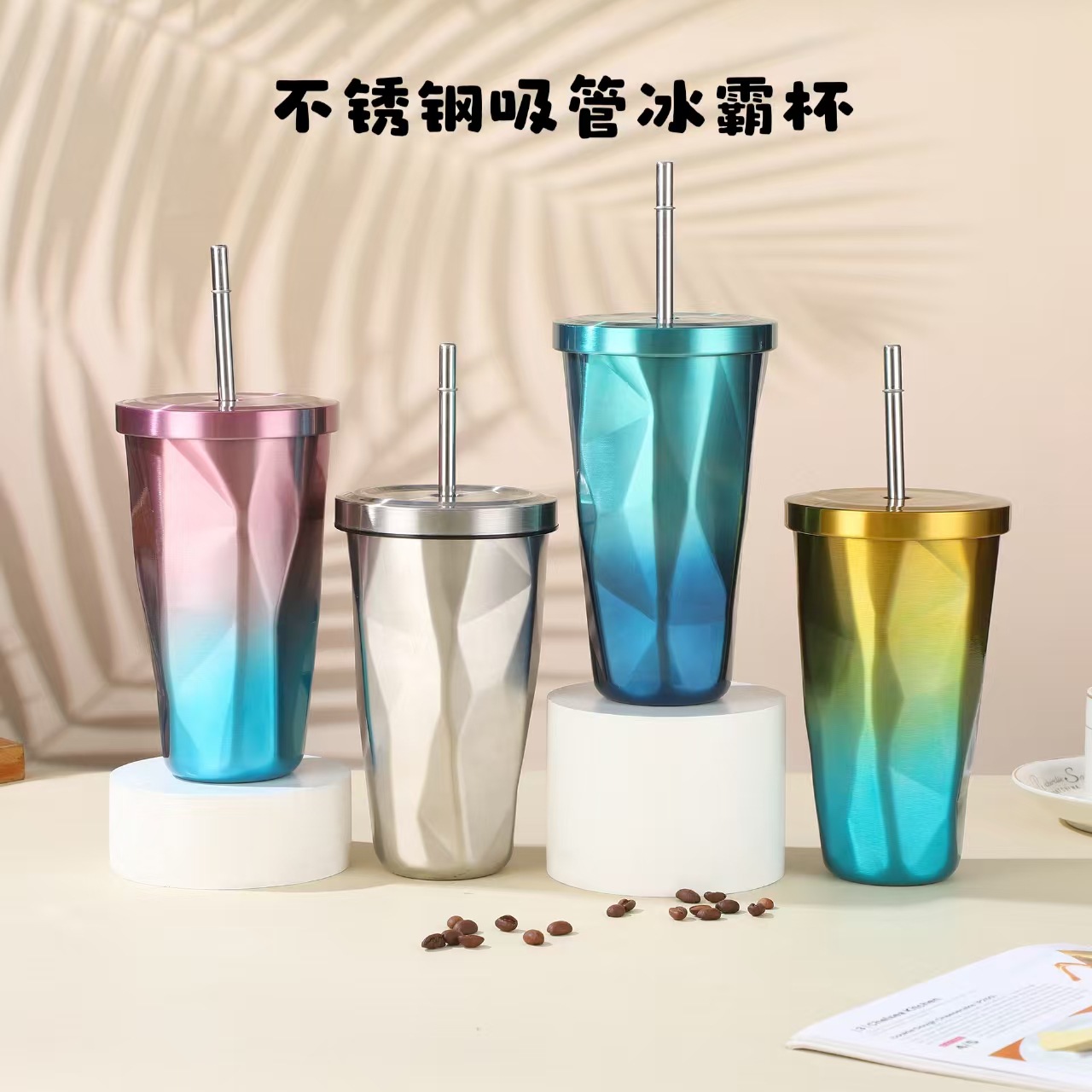 ひし形グラデーション二重304ステンレス大容量ストローコーヒーカップ真空保温異形車載カップ