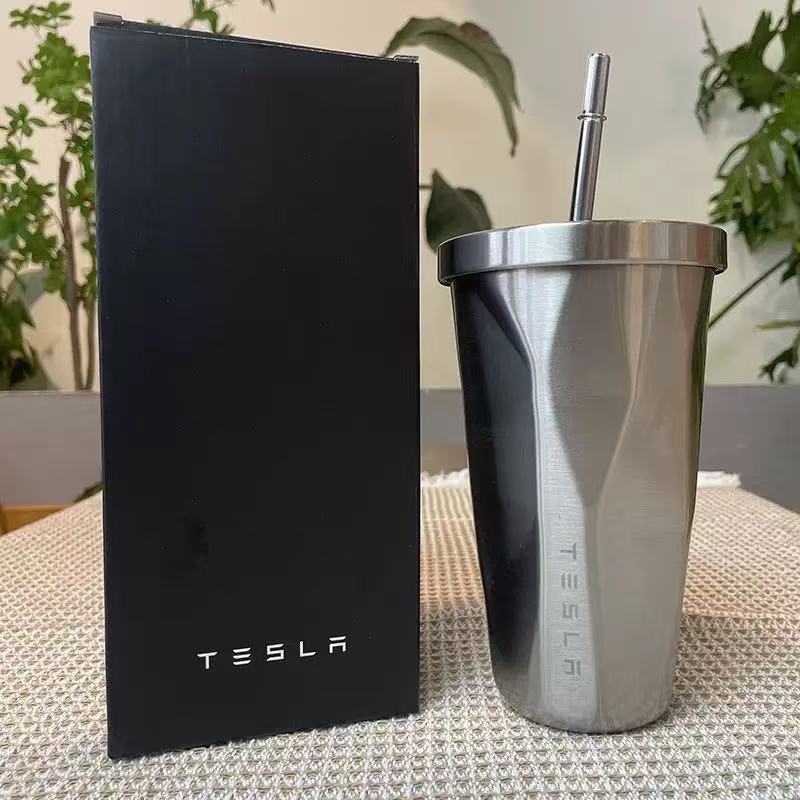 特斯拉双层不锈钢吸管杯礼品杯厂家批发同款带盖真空咖啡杯