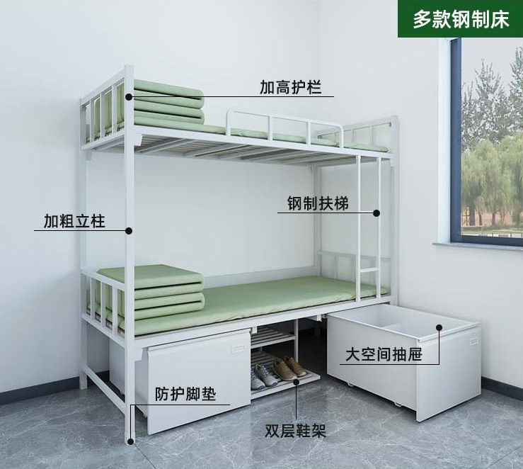 上下に鉄製のベッドを敷いて、寮の上下のベッドをカスタマイズします。