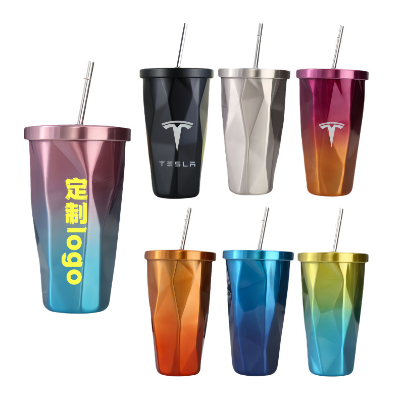 クロスボーダーカスタム304ステンレス鋼のひし形ストローカップグラデーション変色大容量コーヒーカップ屋外車載アイスカップ
