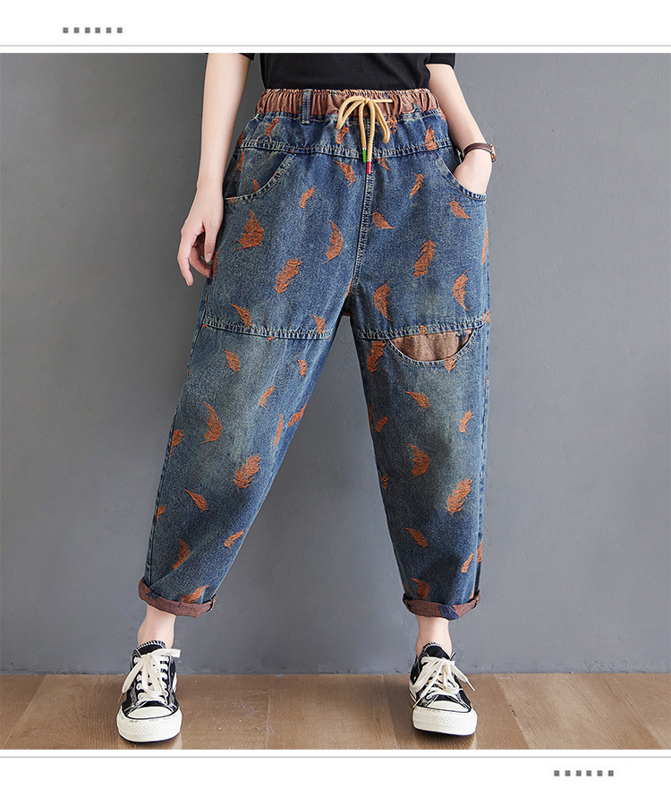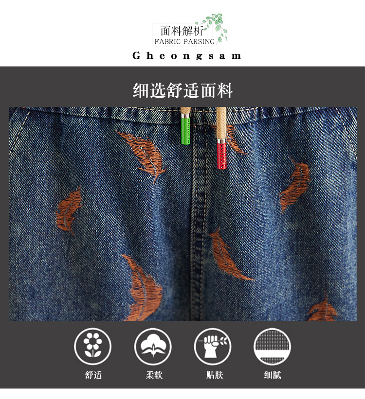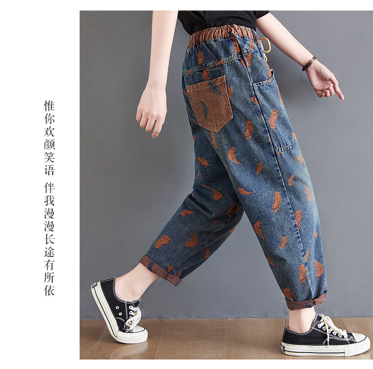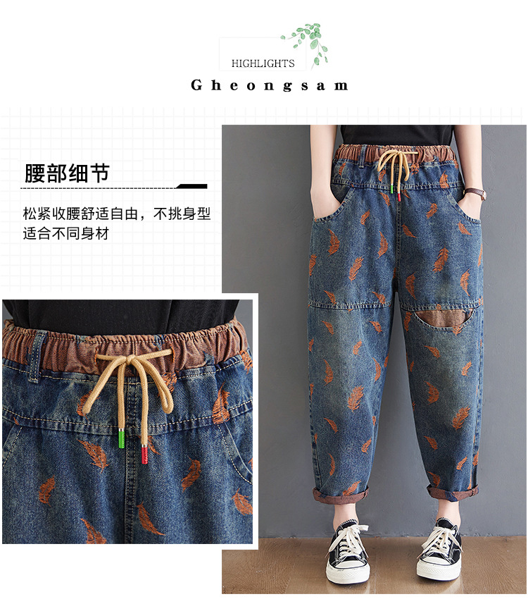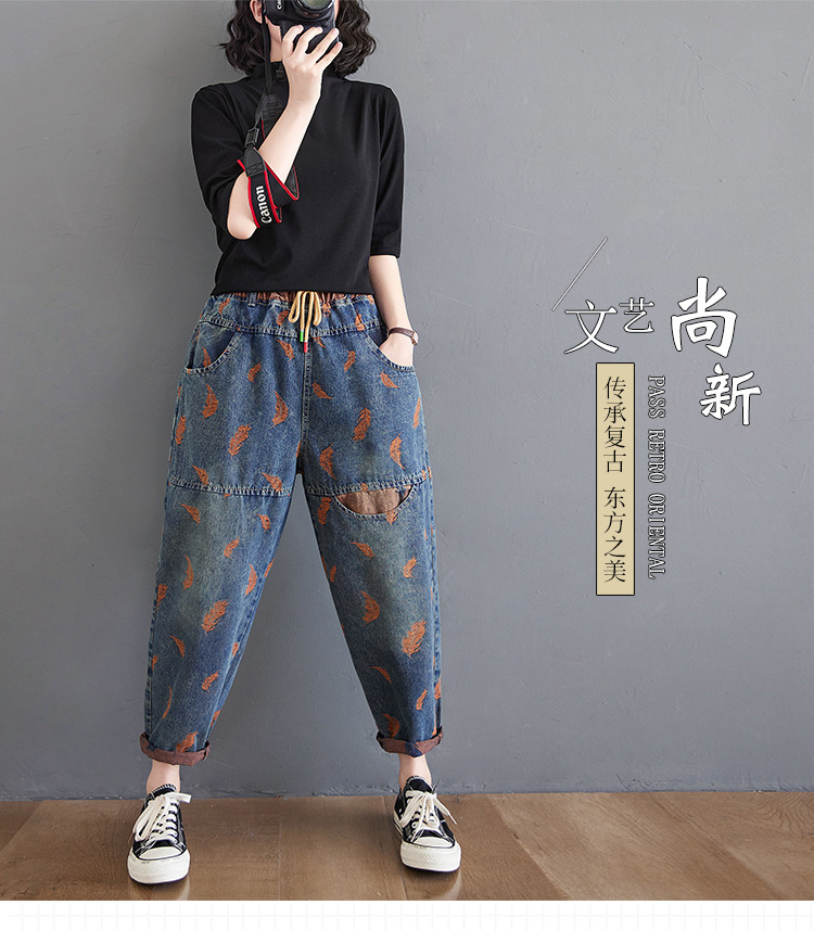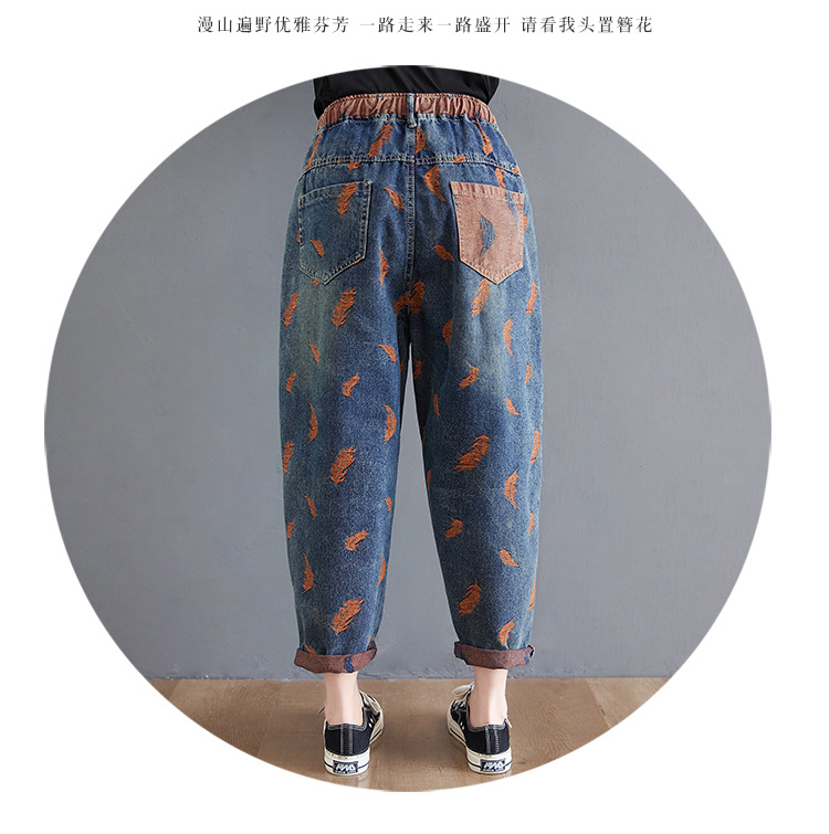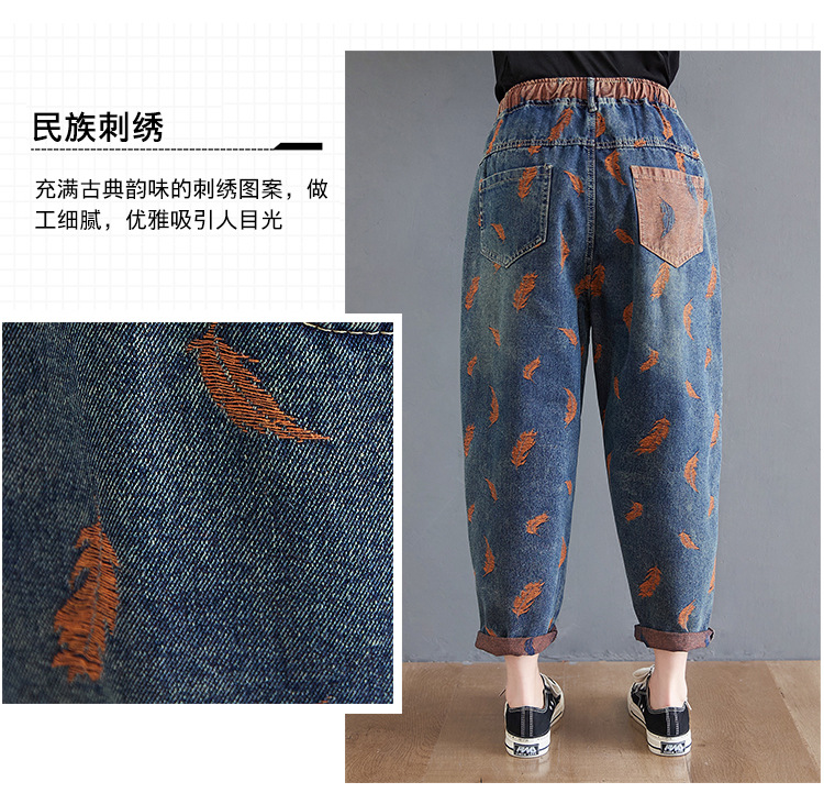 实拍 2021春款文艺大码胖mm提花羽毛宽松显瘦个性牛仔裤