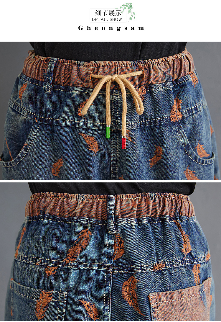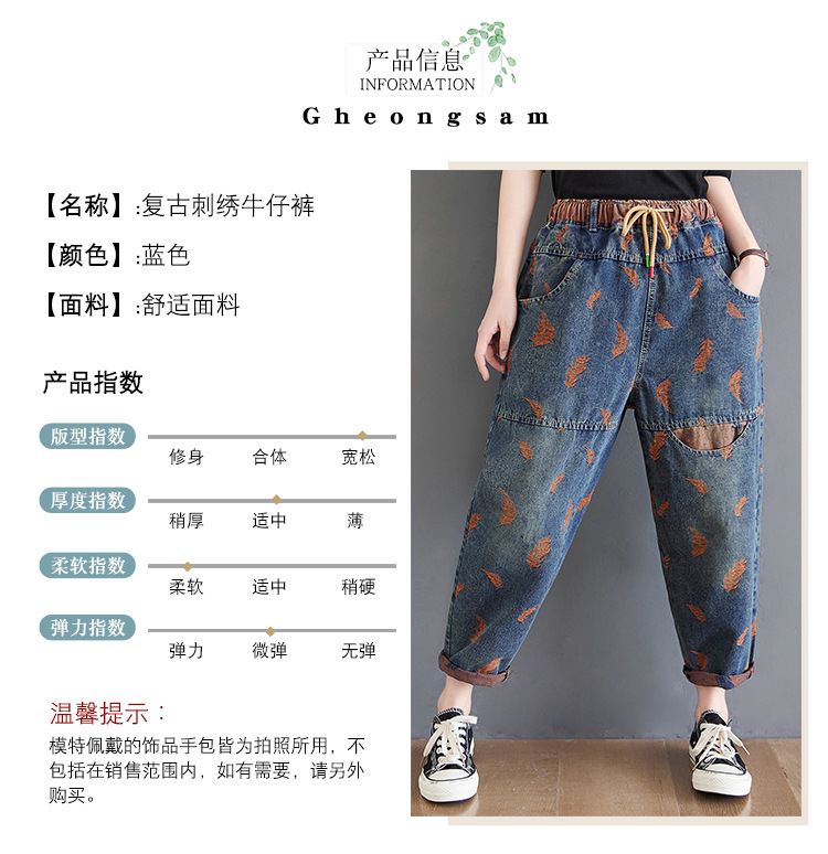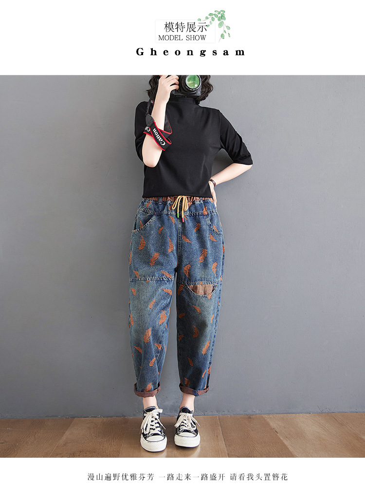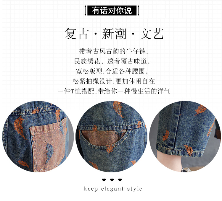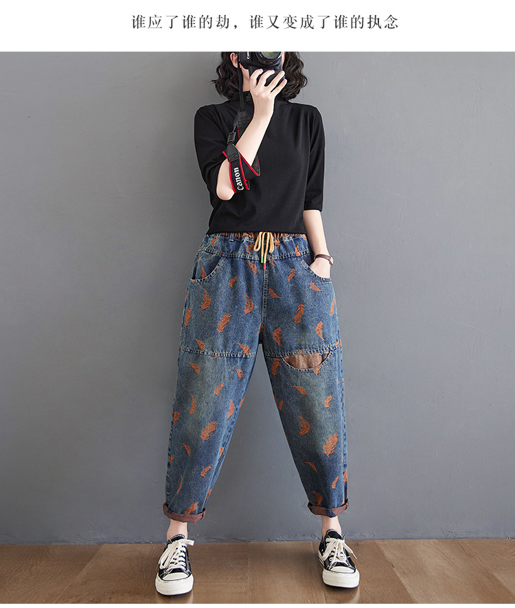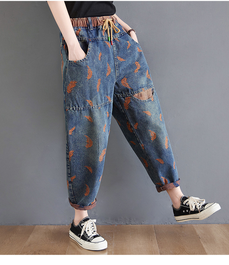 实拍 2021春款文艺大码胖mm提花羽毛宽松显瘦个性牛仔裤