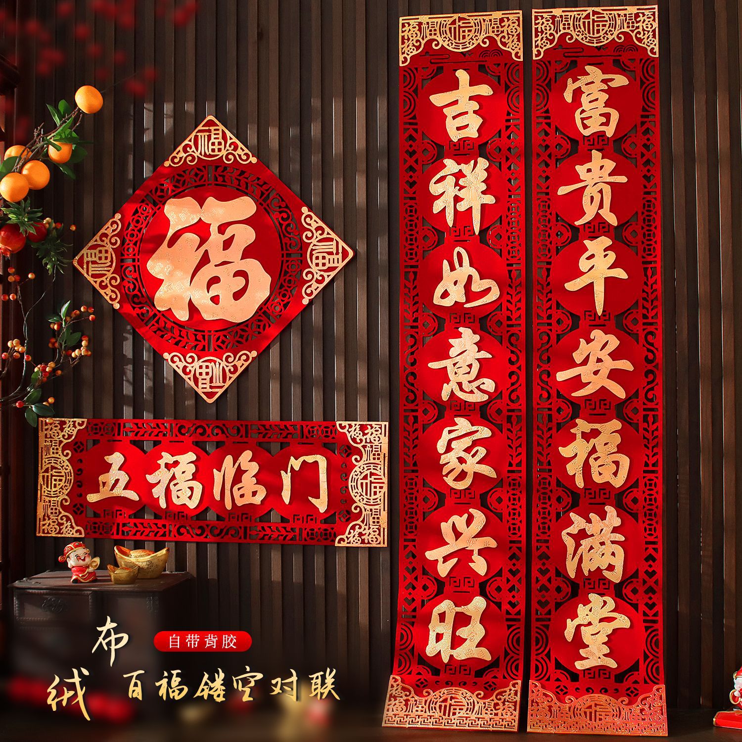 2026年馬年新作玄関ドア用粘着式ベルベット春節用高級福文字春聯