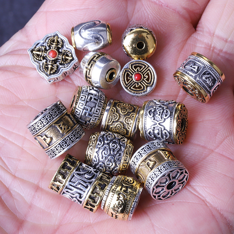 チベットシルバーの二色ザキラムバレルビーズ、八宝スペーサービーズ、護身のお守り、祥雲、六字マントラ、大穴ビーズ、DIYアクセサリー
