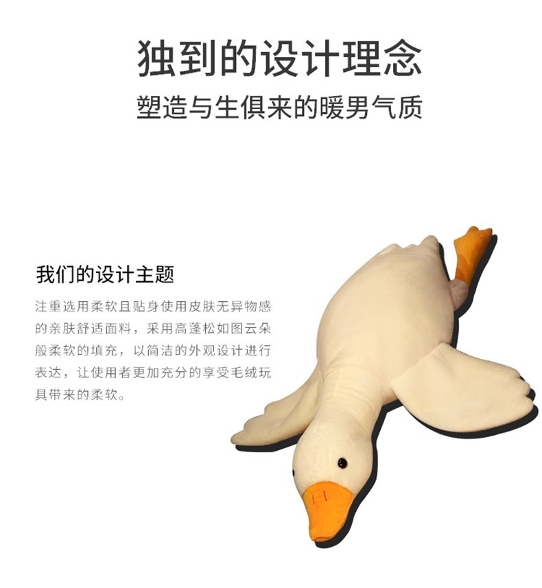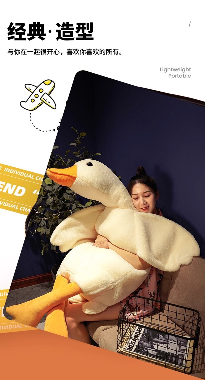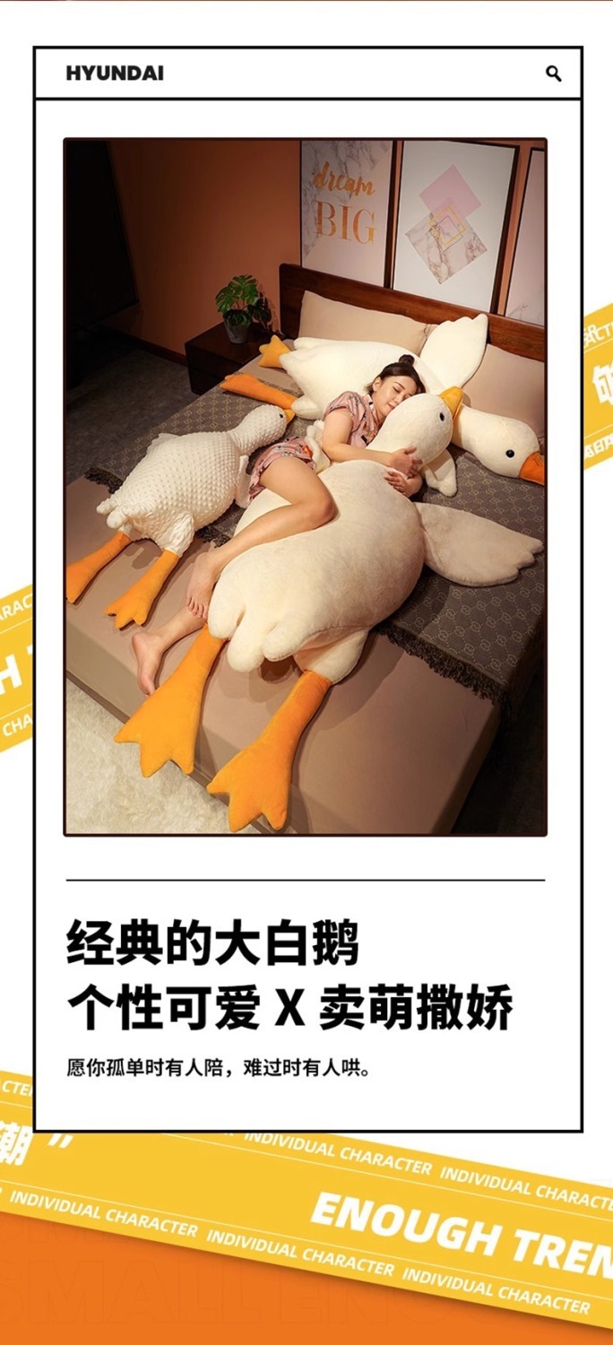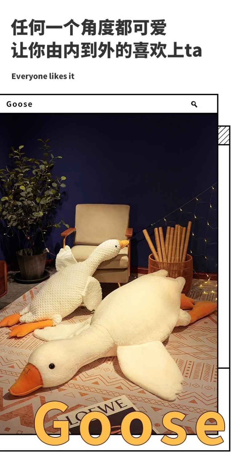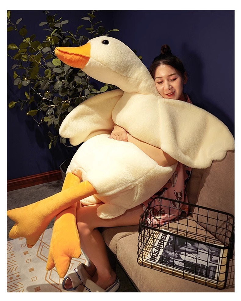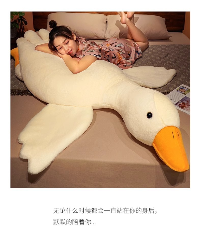 ガチョウは枕のぬいぐるみを抱いています。ガチョウのぬいぐるみは寝ています。